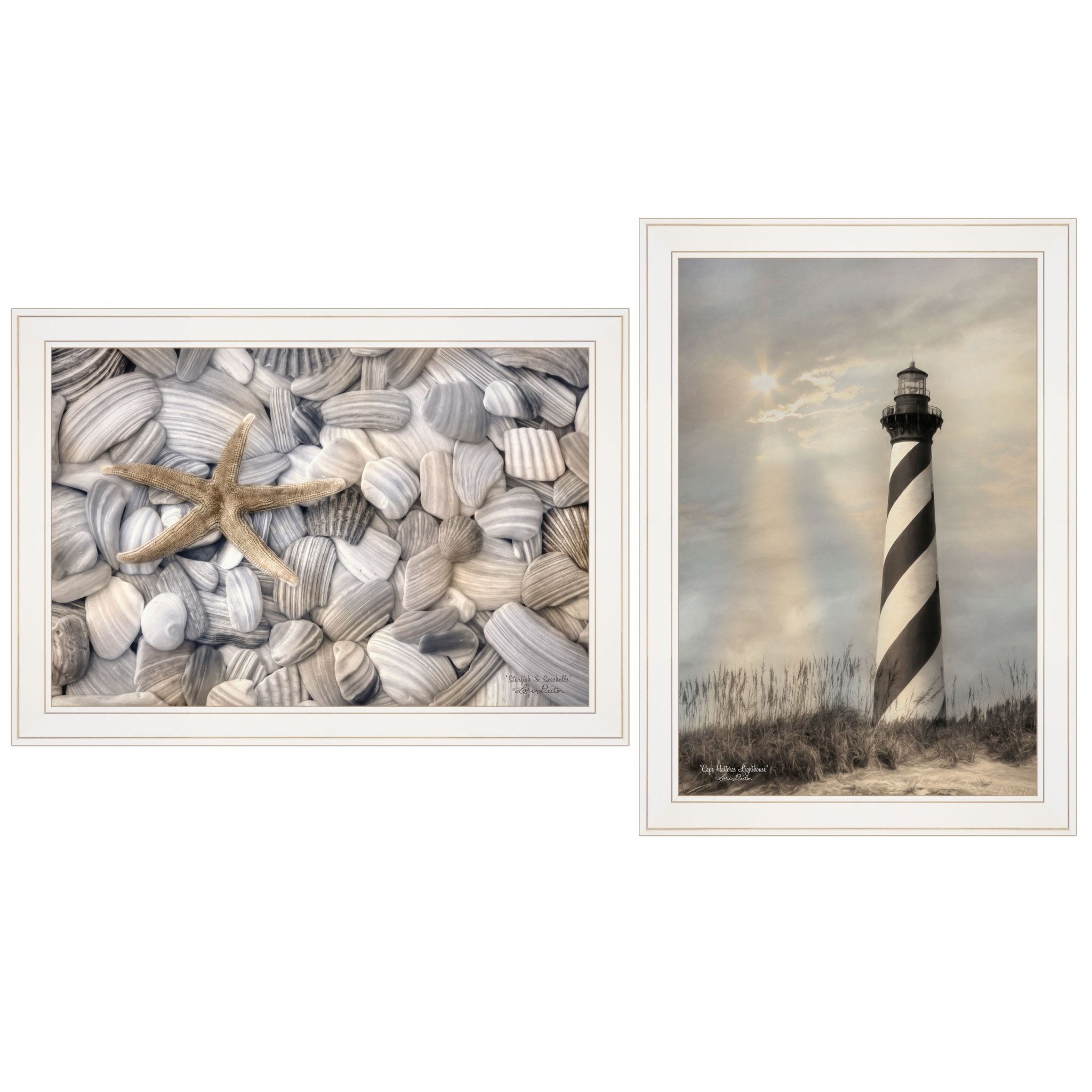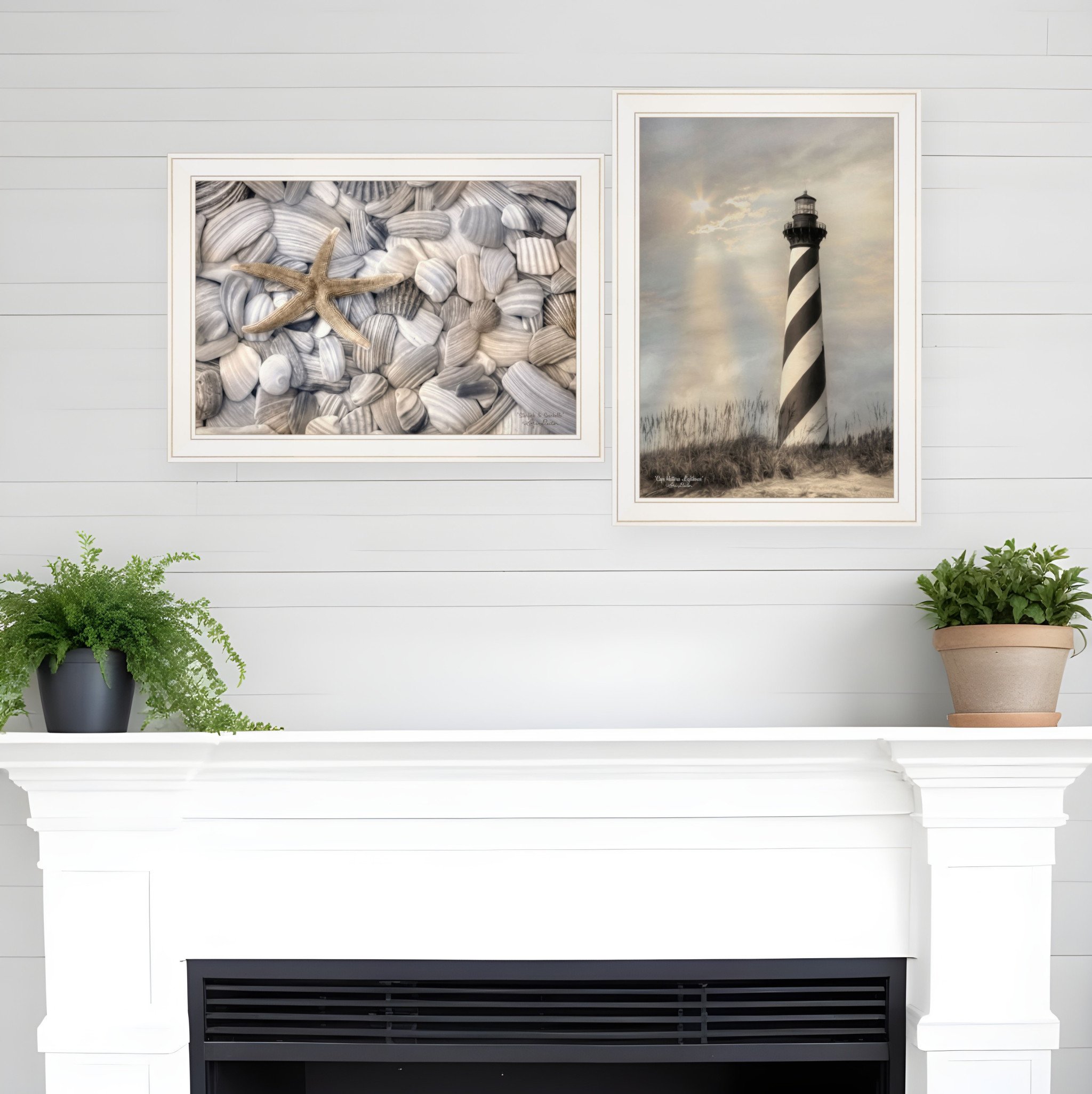 This set of two cape hatteras lighthouse and sea shells 3 white framed print wall art will add a beautiful decorative accent to your decor. This print is a visual artistic expression that allows you to decorate your space in style. Reproduced for you on paper, this hanging decorative accent will be a trendy and fashionable way to dress your walls. Hang on your wall to add some up to date fashion and decoration. Utilize this opportunity to create a focal point in the room with this fabulous wall decor option. 15-inch H x 21-inch W x 1-inch D