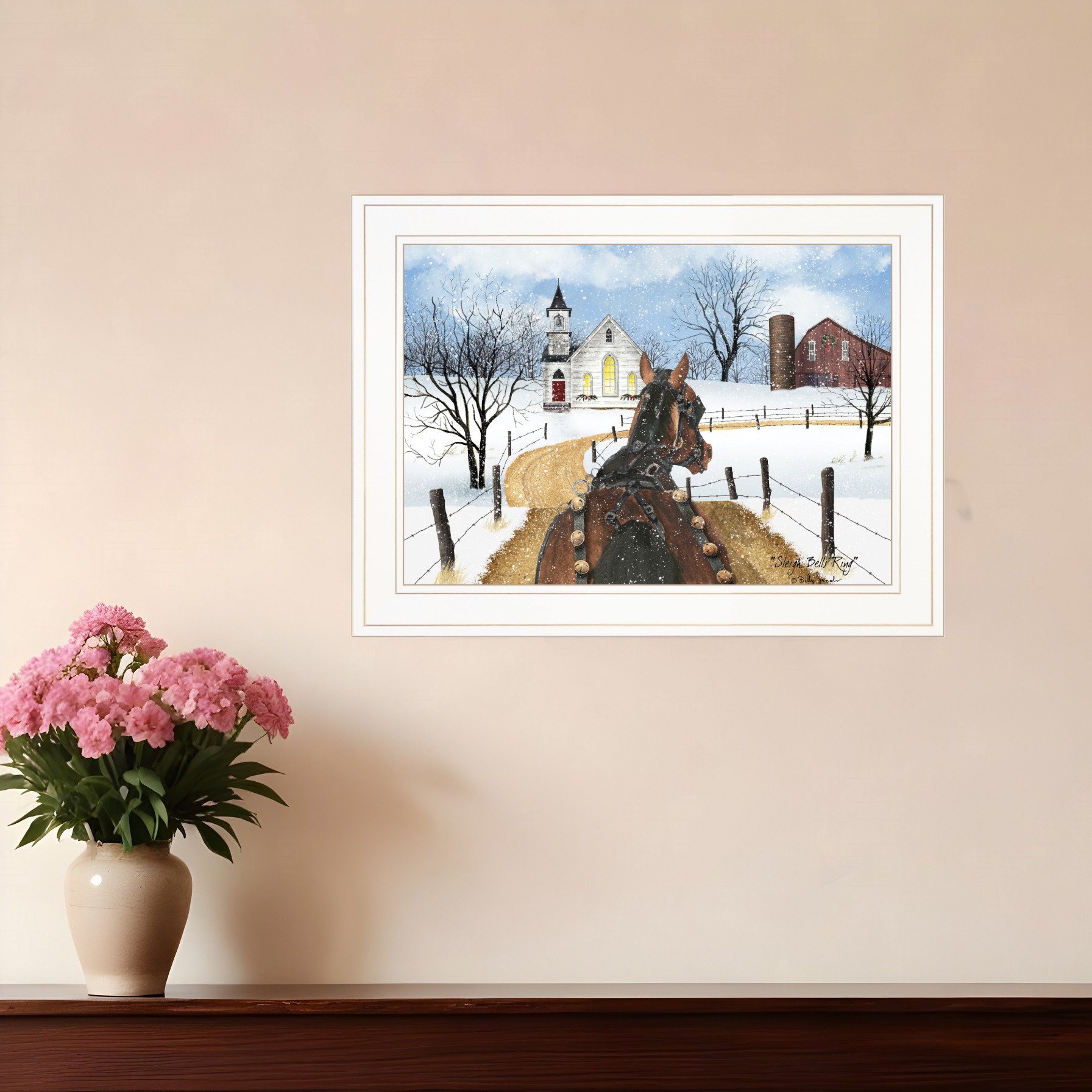 Bring some sizzle to your space with this eye-catching sleigh bells ring 2 white framed print wall art. This print is a visual artistic expression that allows you to decorate your space in style. Reproduced for you on wood, this hanging decorative accent will be a trendy and fashionable way to dress your walls in a rustic and modern farmhouse vibe. Adding this hanging wall art to your space to make your room feel more finished and attractive. Utilize this opportunity to create a focal point in the room with this fabulous wall decor option. 15-inch H x 19-inch W x 1-inch D