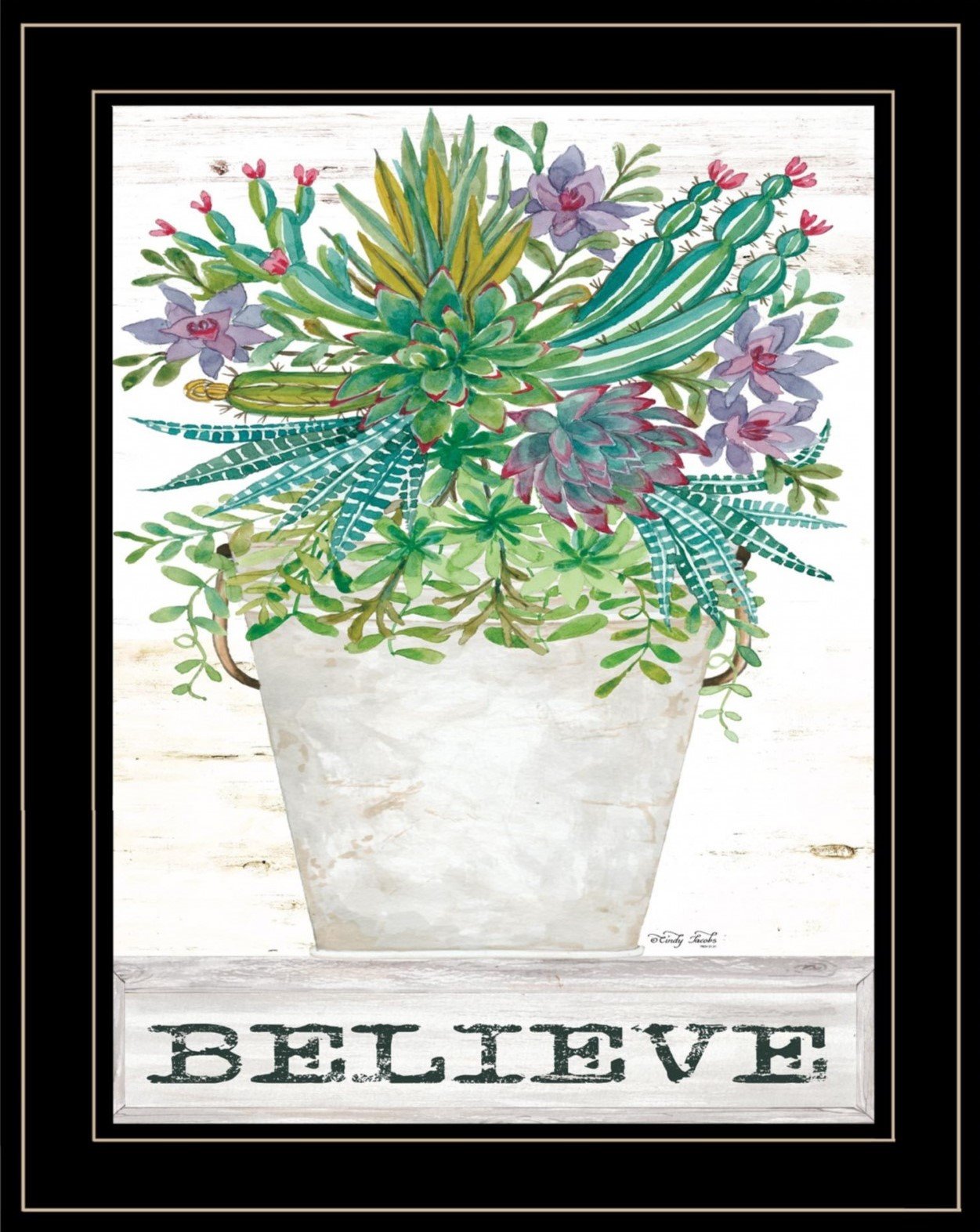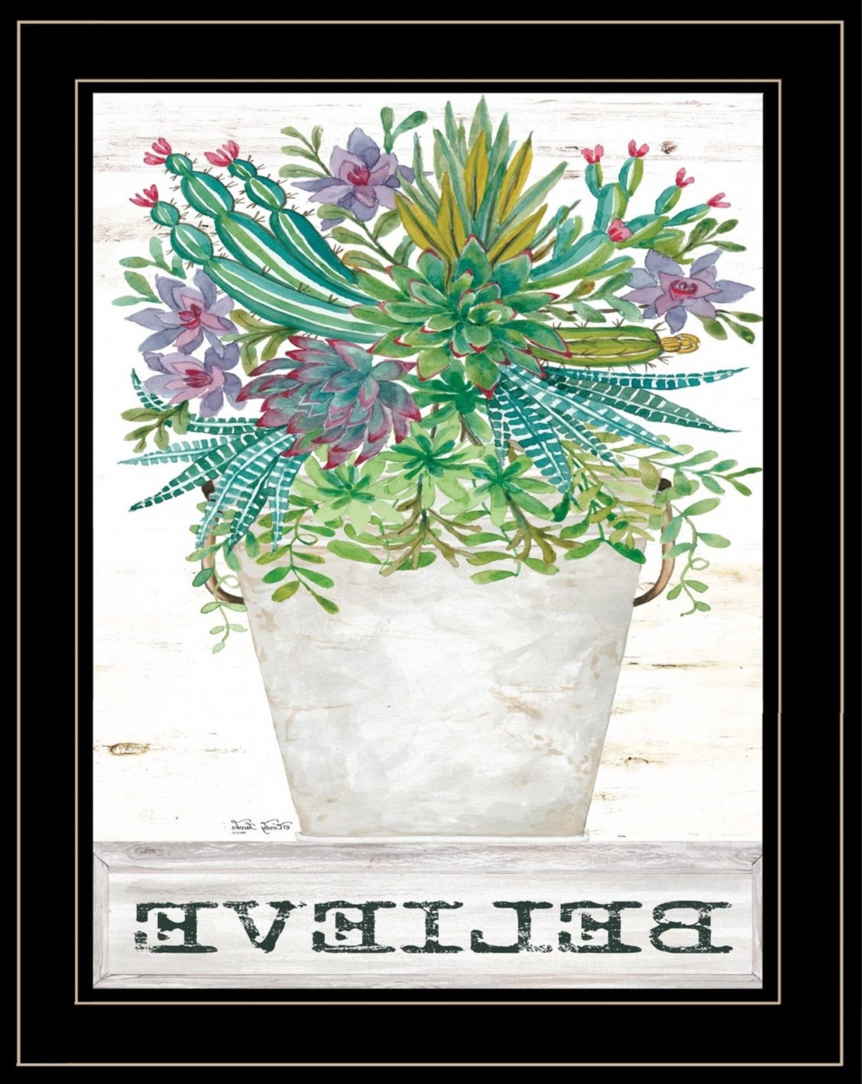 Bring some sizzle to your space with this eye-catching believe succulents 3 black framed print wall art. This print is a visual artistic expression that allows you to decorate your space in style. Reproduced for you on wood, this hanging decorative accent will be a trendy and fashionable way to dress your walls in a rustic and modern farmhouse vibe. Hang on your wall to add some up to date fashion and decoration. Utilize this opportunity to create a focal point in the room with this fabulous wall decor option. 19-inch H x 15-inch W x 1-inch D