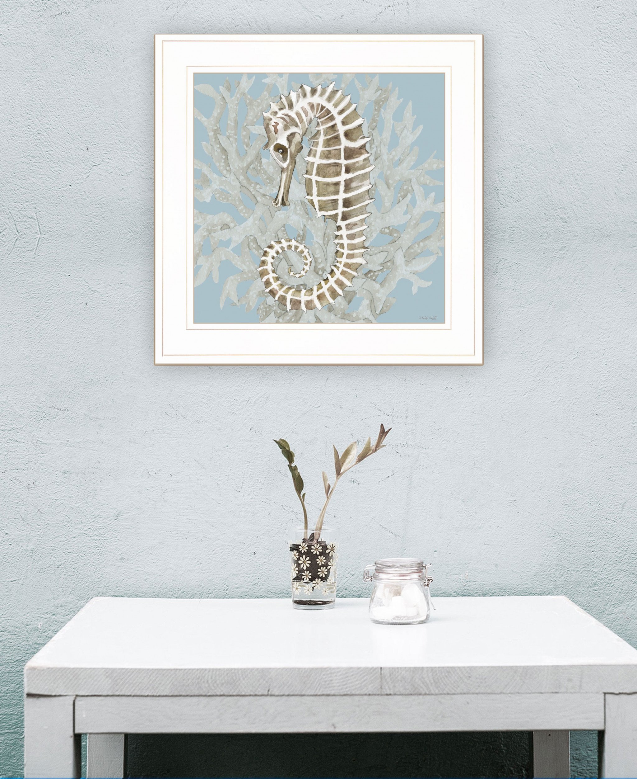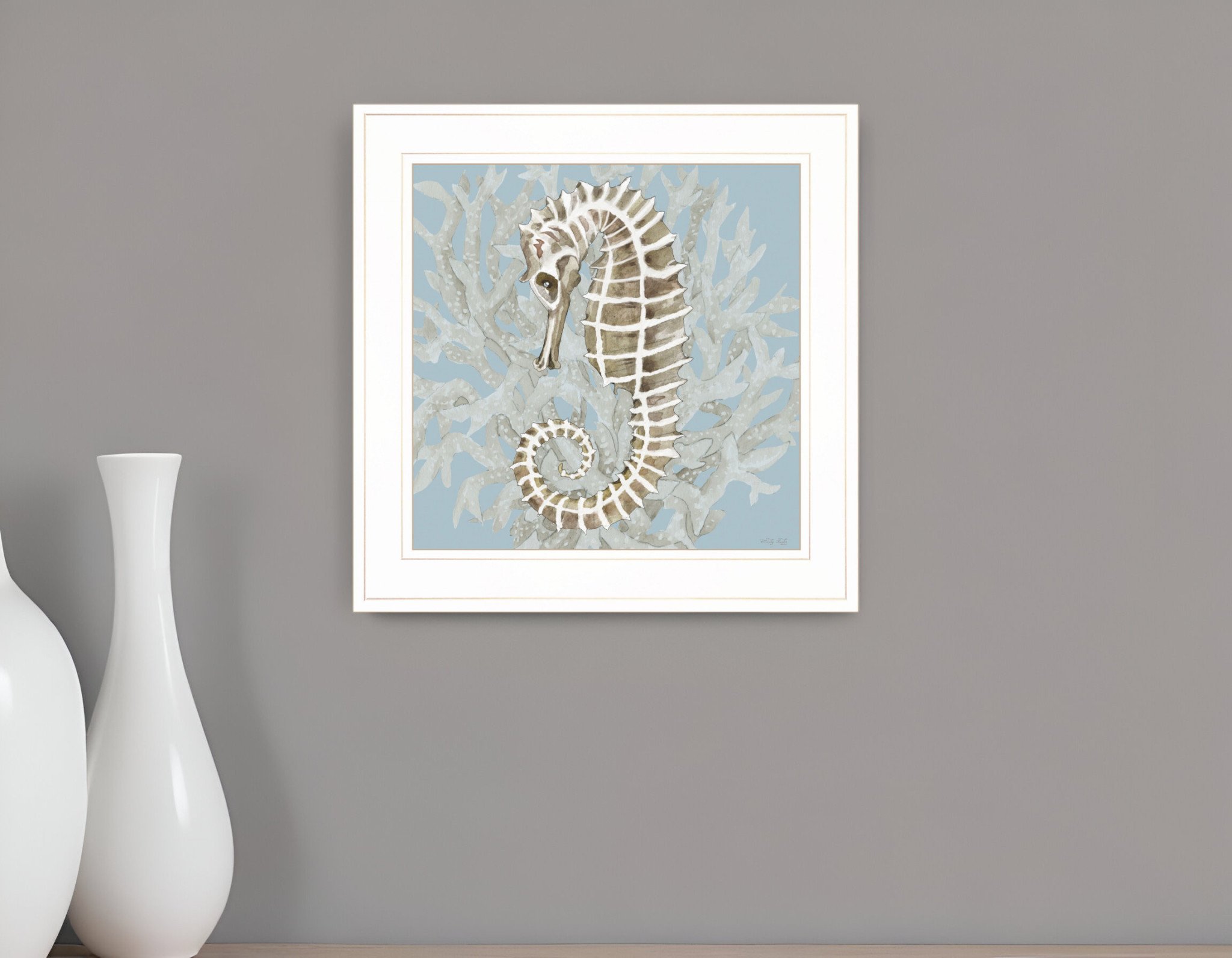 Add an air of fashion to your room and rejuvenate the space with this coral seahorse ii 2 white framed print wall art. This print is a visual artistic expression that allows you to decorate your space in style. Reproduced for you on wood, this hanging decorative accent will be a trendy and fashionable way to dress your walls in a rustic and modern farmhouse vibe. Hang on your wall to add some up to date fashion and decoration. Utilize this opportunity to create a focal point in the room with this fabulous wall decor option. 15-inch H x 15-inch W x 1-inch D