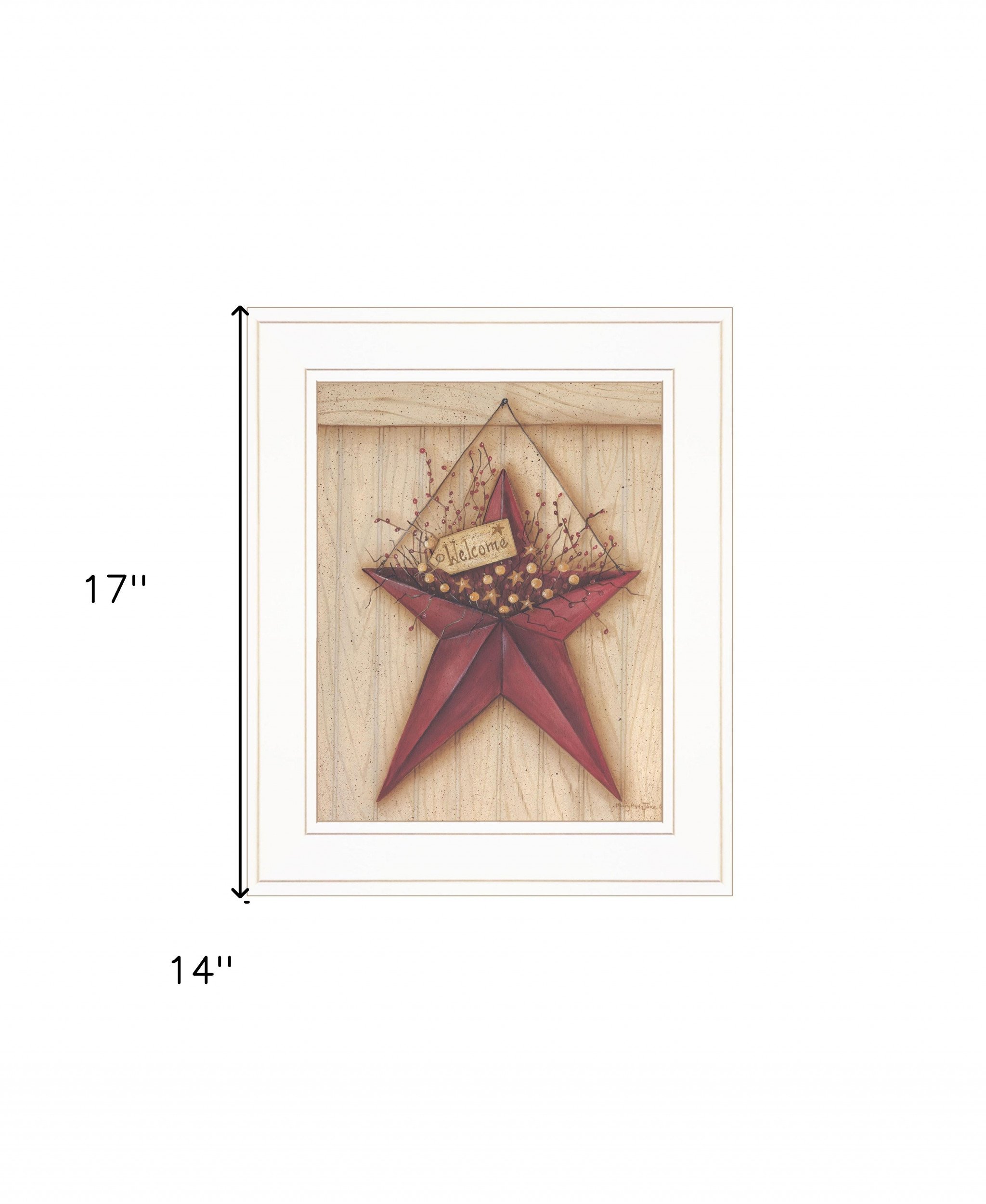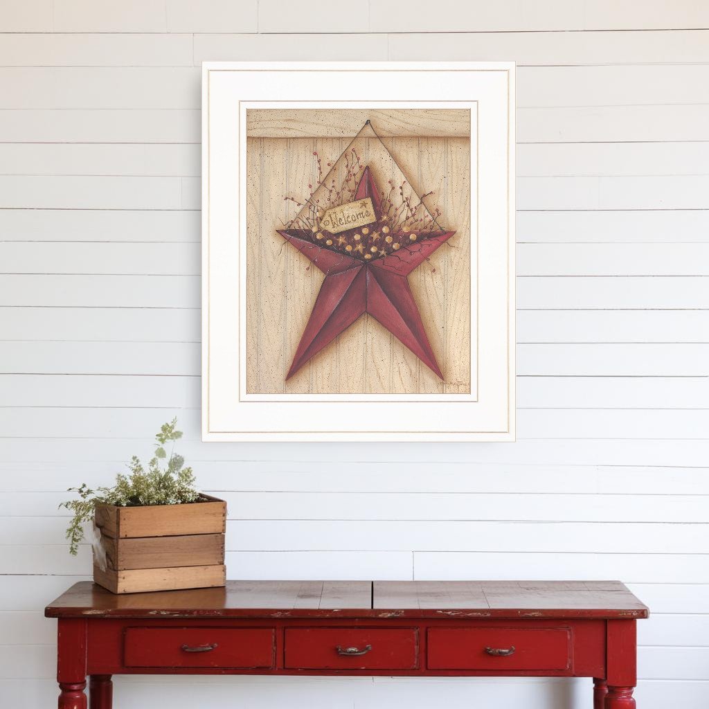 This welcome barn star 2 white framed print wall art will add a beautiful decorative accent to your decor. This print is a visual artistic expression that allows you to decorate your space in style. Reproduced for you on wood, this hanging decorative accent will be a trendy and fashionable way to dress your walls in a rustic and modern farmhouse vibe. Adding this hanging wall art to your space to make your room feel more finished and attractive. Instantly liven up your space with this art that brings color and dimension to your walls. 17-inch H x 14-inch W x 1-inch D