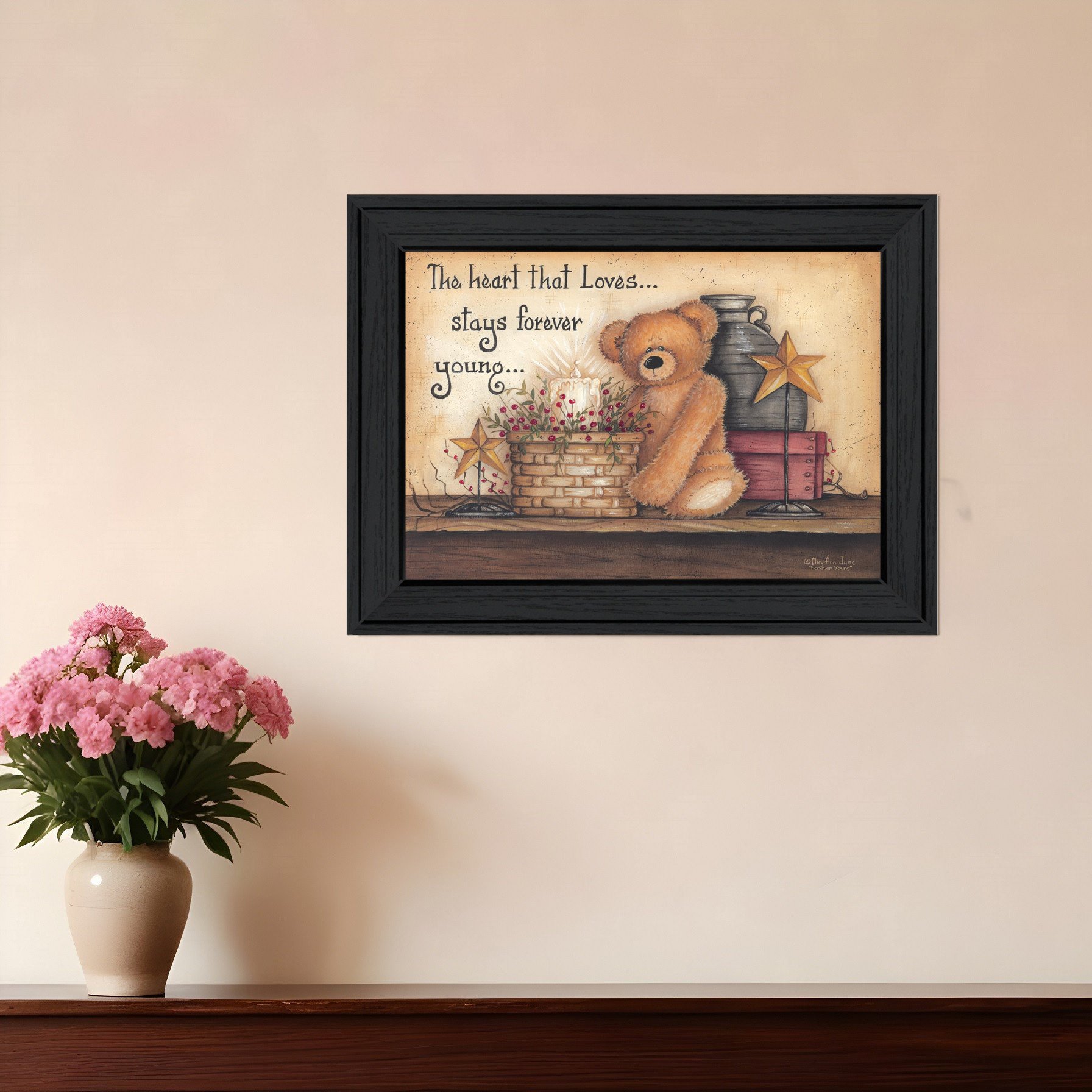 This forever young 1 black framed print wall art will add a beautiful decorative accent to your decor. This print is a visual artistic expression that allows you to decorate your space in style. Reproduced for you on wood, this hanging decorative accent will be a trendy and fashionable way to dress your walls in a rustic and modern farmhouse vibe. Adding this hanging wall art to your space to make your room feel more finished and attractive. Utilize this opportunity to create a focal point in the room with this fabulous wall decor option. 15-inch H x 19-inch W x 1-inch D