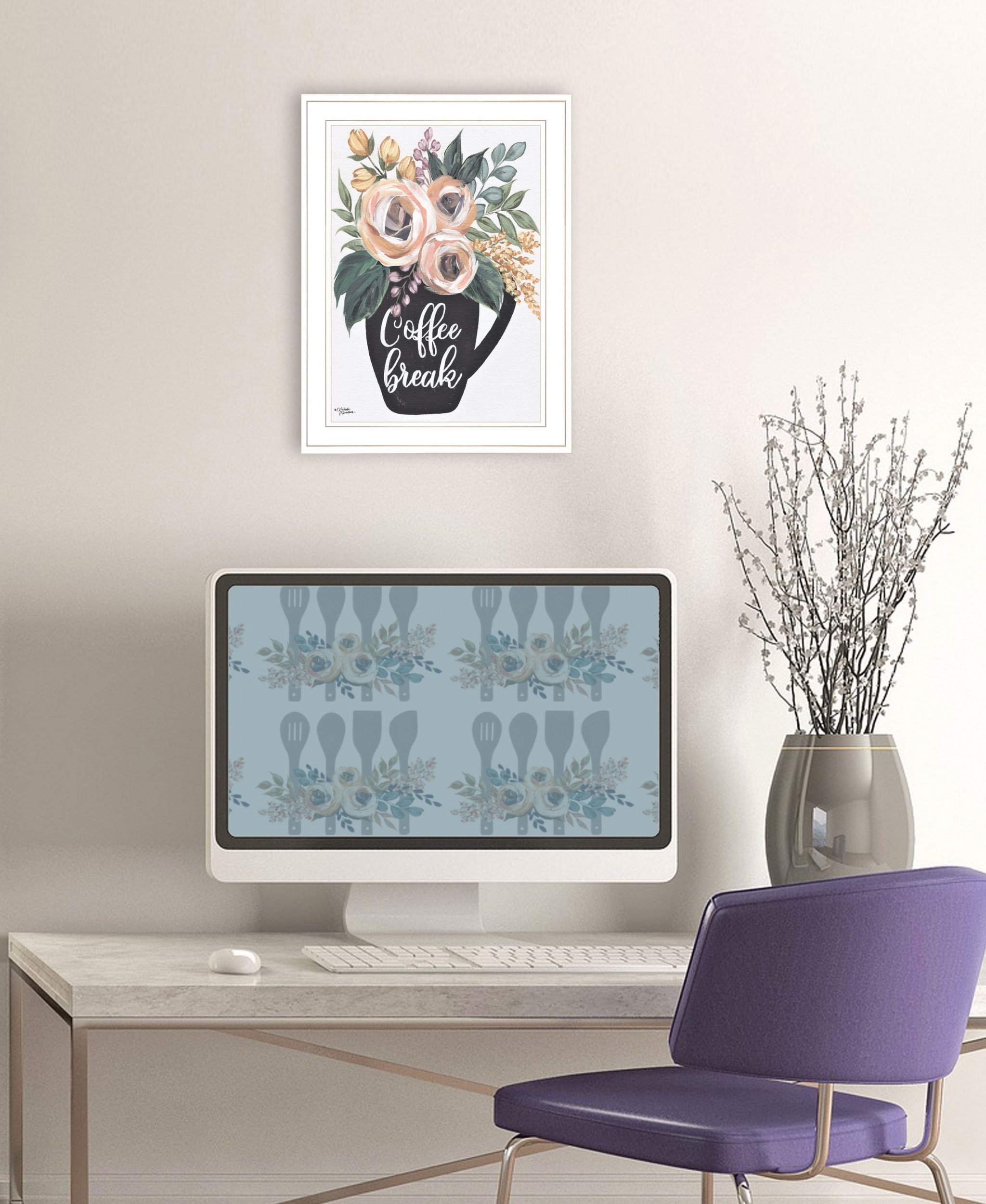 Bring some sizzle to your space with this eye-catching coffee break 1 white framed print kitchen wall art. This print is a visual artistic expression that allows you to decorate your space in style. Reproduced for you on wood, this hanging decorative accent will be a trendy and fashionable way to dress your walls in a rustic and modern farmhouse vibe. Hang on your wall to add some up to date fashion and decoration. Utilize this opportunity to create a focal point in the room with this fabulous wall decor option. 19-inch H x 15-inch W x 1-inch D
