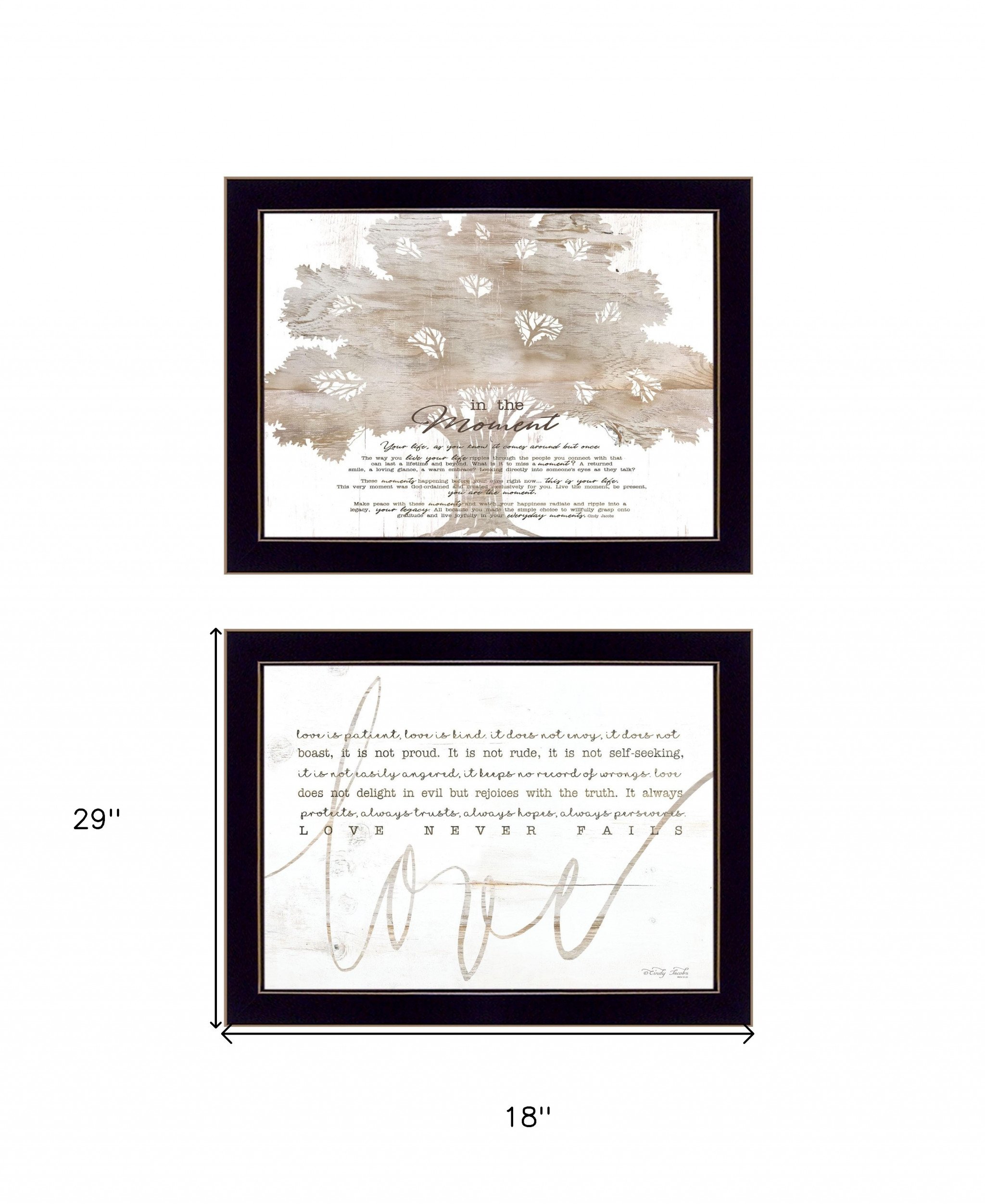 The set of two love or in the moment 2 black framed print wall art is the perfect decorative accessory for your home. This print is a visual artistic expression that allows you to decorate your space in style. Reproduced for you on wood, this hanging decorative accent will be a trendy and fashionable way to dress your walls in a rustic and modern farmhouse vibe. Adding this hanging wall art to your space to make your room feel more finished and attractive. Utilize this opportunity to create a focal point in the room with this fabulous wall decor option. 29-inch H x 18-inch W x 1-inch D