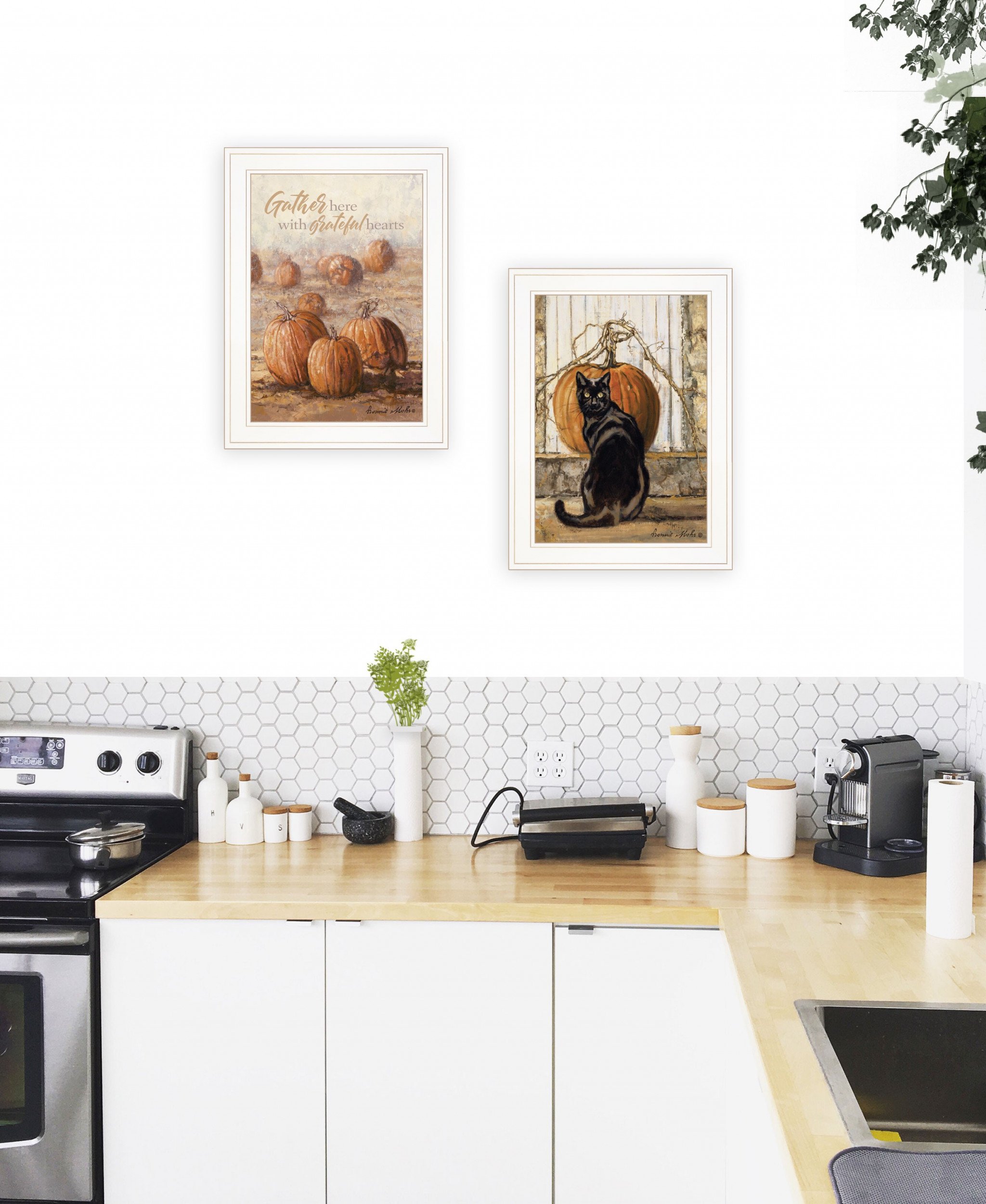 The set of two pumpkins with a black cat 1 white framed print wall art is the perfect decorative accessory for your home. This print is a visual artistic expression that allows you to decorate your space in style. Reproduced for you on wood, this hanging decorative accent will be a trendy and fashionable way to dress your walls in a rustic and modern farmhouse vibe. Hang on your wall to add some up to date fashion and decoration. Instantly liven up your space with this art that brings color and dimension to your walls. 35-inch H x 19-inch W x 1-inch D