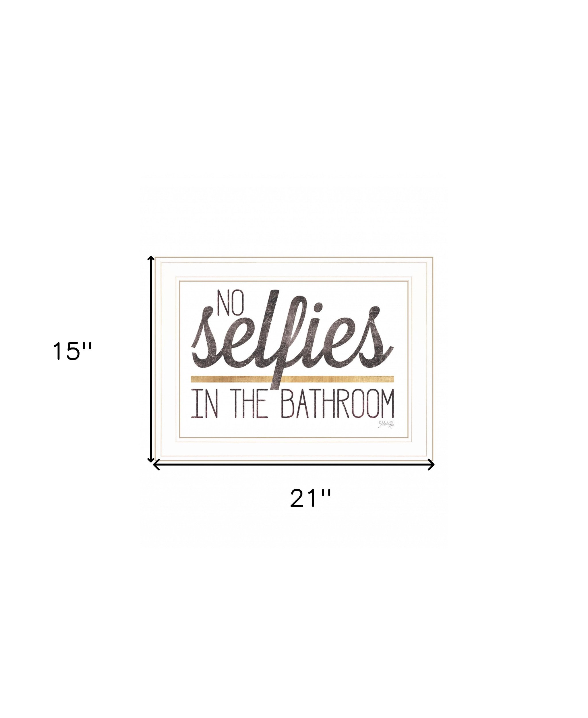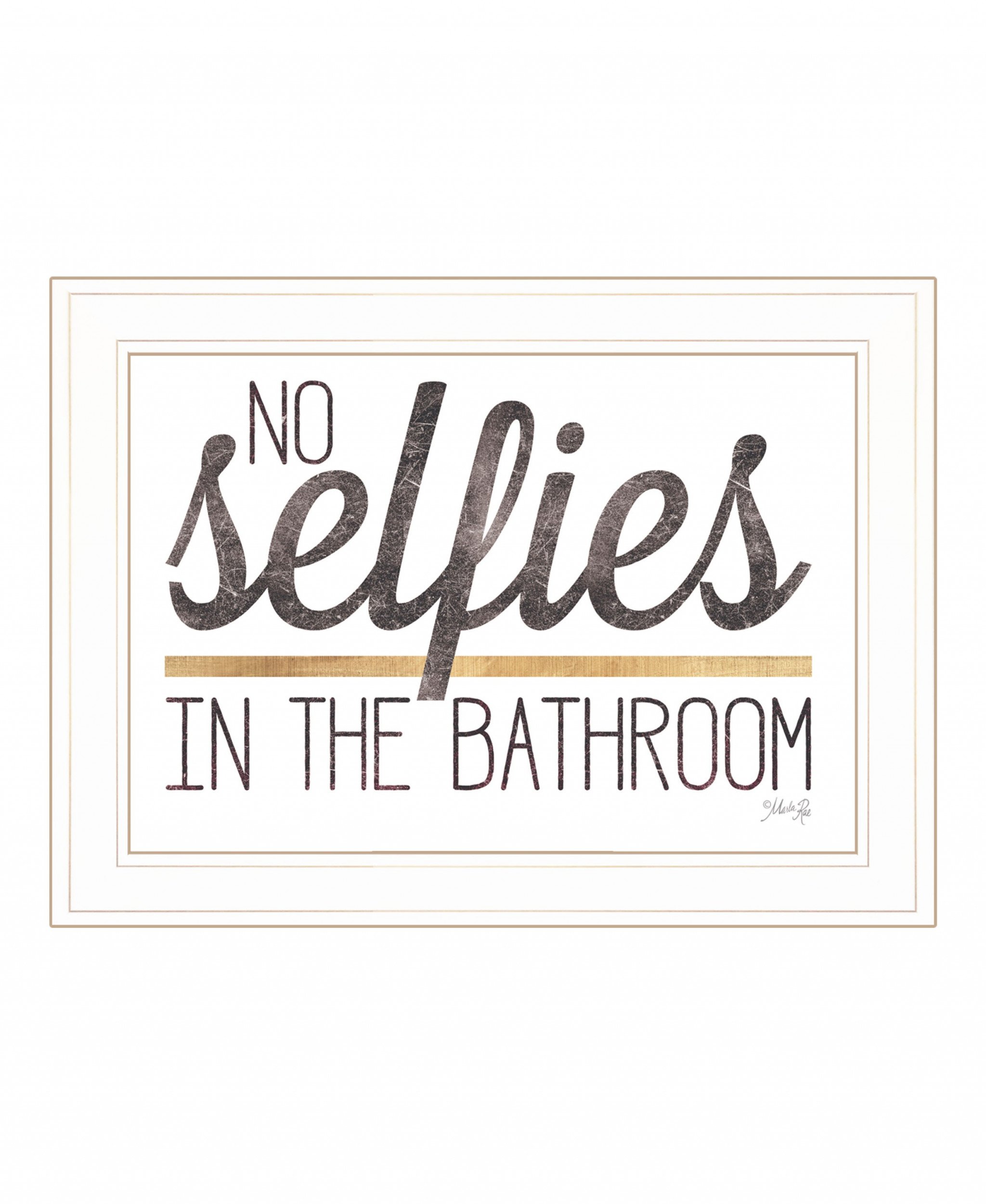 Bring some sizzle to your space with this eye-catching no selfies in the bathroom 5 white framed print bathroom wall art. This print is a visual artistic expression that allows you to decorate your space in style. Reproduced for you on wood, this hanging decorative accent will be a trendy and fashionable way to dress your walls in a rustic and modern farmhouse vibe. Hang on your wall to add some up to date fashion and decoration. Instantly liven up your space with this art that brings color and dimension to your walls. 15-inch H x 21-inch W x 1-inch D