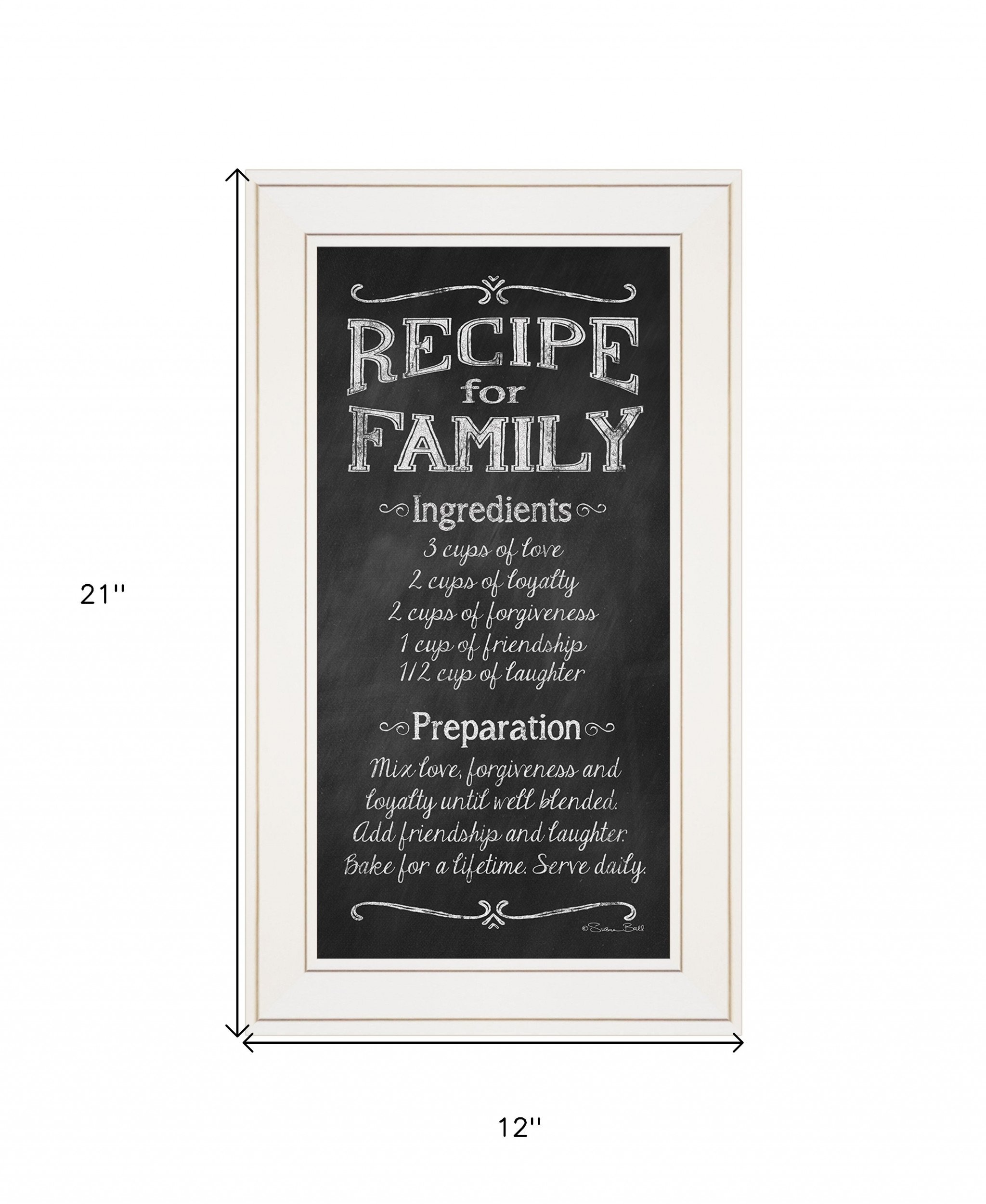 This recipe for family white framed print wall art will add a beautiful decorative accent to your decor. This print is a visual artistic expression that allows you to decorate your space in style. Reproduced for you on wood, this hanging decorative accent will be a trendy and fashionable way to dress your walls in a rustic and modern farmhouse vibe. Hang on your wall to add some up to date fashion and decoration. Instantly liven up your space with this art that brings color and dimension to your walls. 21-inch H x 12-inch W x 1-inch D