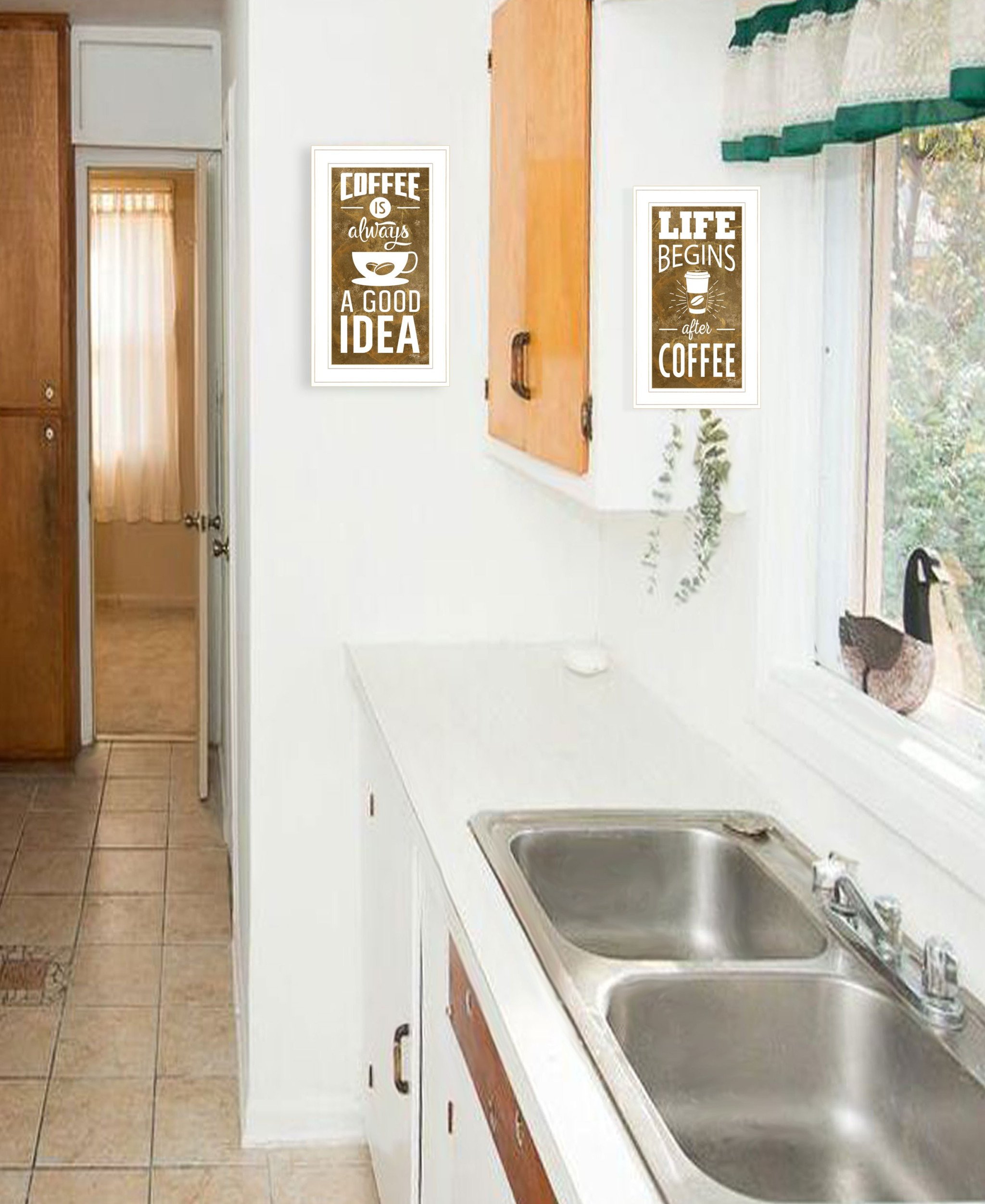 The set of two life begins and ends with coffee white framed print wall art is the perfect decorative accessory for your home. This print is a visual artistic expression that allows you to decorate your space in style. Reproduced for you on wood, this hanging decorative accent will be a trendy and fashionable way to dress your walls in a rustic and modern farmhouse vibe. Hang on your wall to add some up to date fashion and decoration. Instantly liven up your space with this art that brings color and dimension to your walls. 21-inch H x 25-inch W x 1-inch D