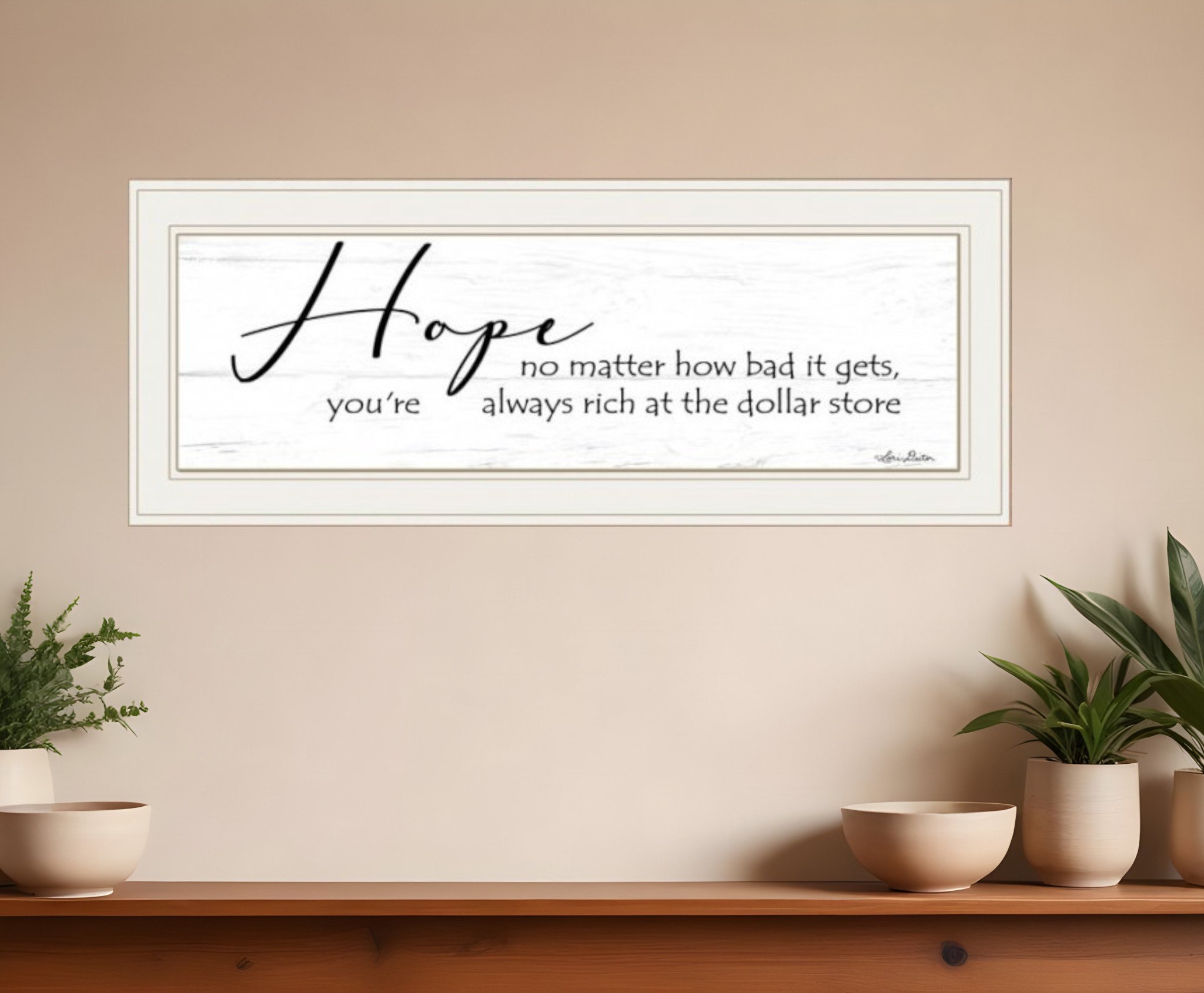 The hope 1 white framed print wall art is the perfect decorative accessory for your home. This print is a visual artistic expression that allows you to decorate your space in style. Reproduced for you on paper, this hanging decorative accent will be a trendy and fashionable way to dress your walls. Hang on your wall to add some up to date fashion and decoration. Instantly liven up your space with this art that brings color and dimension to your walls. 11-inch H x 23-inch W x 1-inch D