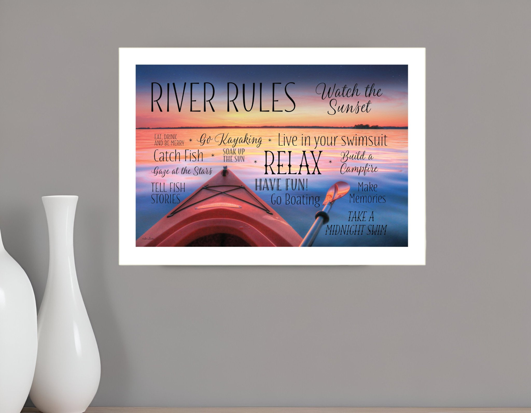 This river rules 2 white framed print wall art will add a beautiful decorative accent to your decor. This print is a visual artistic expression that allows you to decorate your space in style. Reproduced for you on paper, this hanging decorative accent will be a trendy and fashionable way to dress your walls. Hang on your wall to add some up to date fashion and decoration. Instantly liven up your space with this art that brings color and dimension to your walls. 14-inch H x 20-inch W x 1-inch D