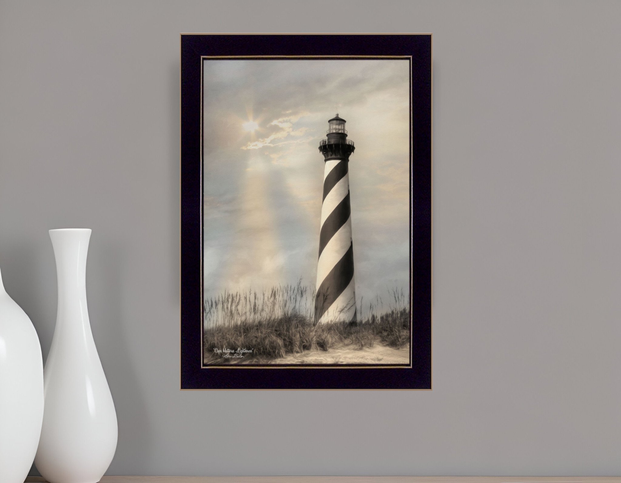 This cape hatteras lighthouse 1 black framed print wall art will add a beautiful decorative accent to your decor. This print is a visual artistic expression that allows you to decorate your space in style. Reproduced for you on paper, this hanging decorative accent will be a trendy and fashionable way to dress your walls. Adding this hanging wall art to your space to make your room feel more finished and attractive. Utilize this opportunity to create a focal point in the room with this fabulous wall decor option. 20-inch H x 14-inch W x 1-inch D