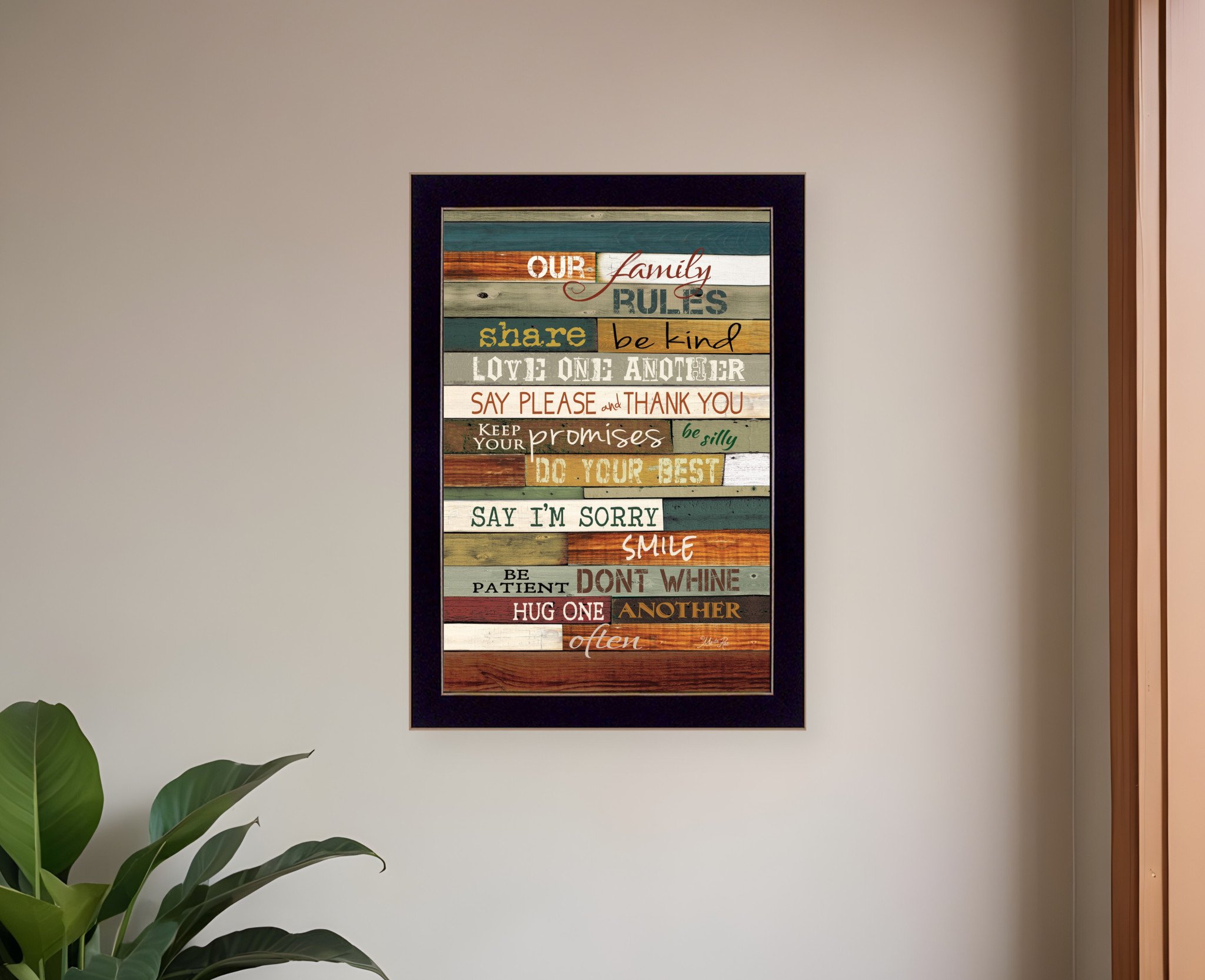 Unique and decorative, this our family rules 1 black framed print wall art will leave a lasting impression. This print is a visual artistic expression that allows you to decorate your space in style. Reproduced for you on paper, this hanging decorative accent will be a trendy and fashionable way to dress your walls. Adding this hanging wall art to your space to make your room feel more finished and attractive. Instantly liven up your space with this art that brings color and dimension to your walls. 10-inch H x 14-inch W x 1-inch D