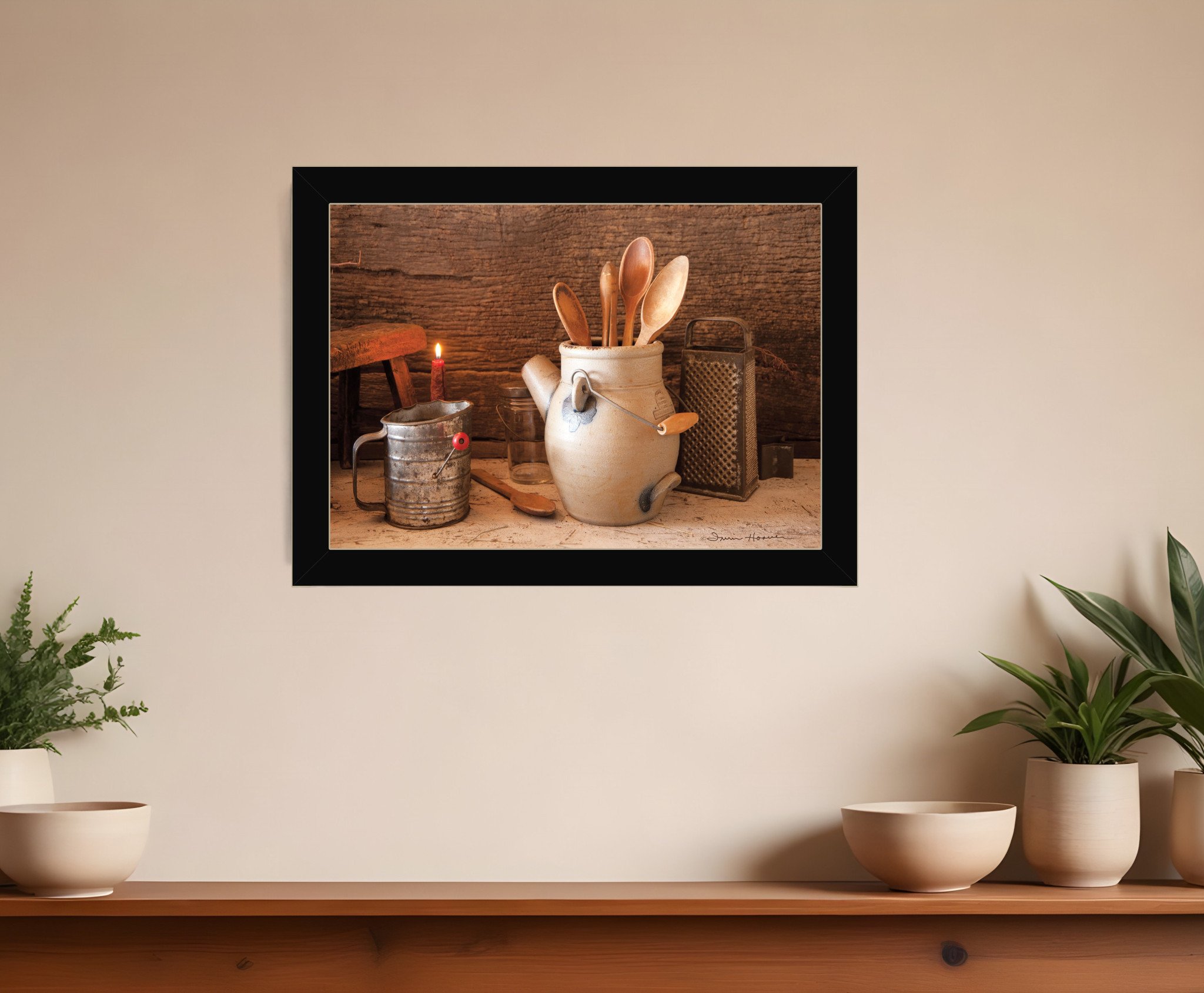 This grandmas kitchen tools 1 black framed print kitchen wall art will add a beautiful decorative accent to your decor. This print is a visual artistic expression that allows you to decorate your space in style. Reproduced for you on paper, this hanging decorative accent will be a trendy and fashionable way to dress your walls. Adding this hanging wall art to your space to make your room feel more finished and attractive. Instantly liven up your space with this art that brings color and dimension to your walls. 14-inch H x 20-inch W x 1-inch D
