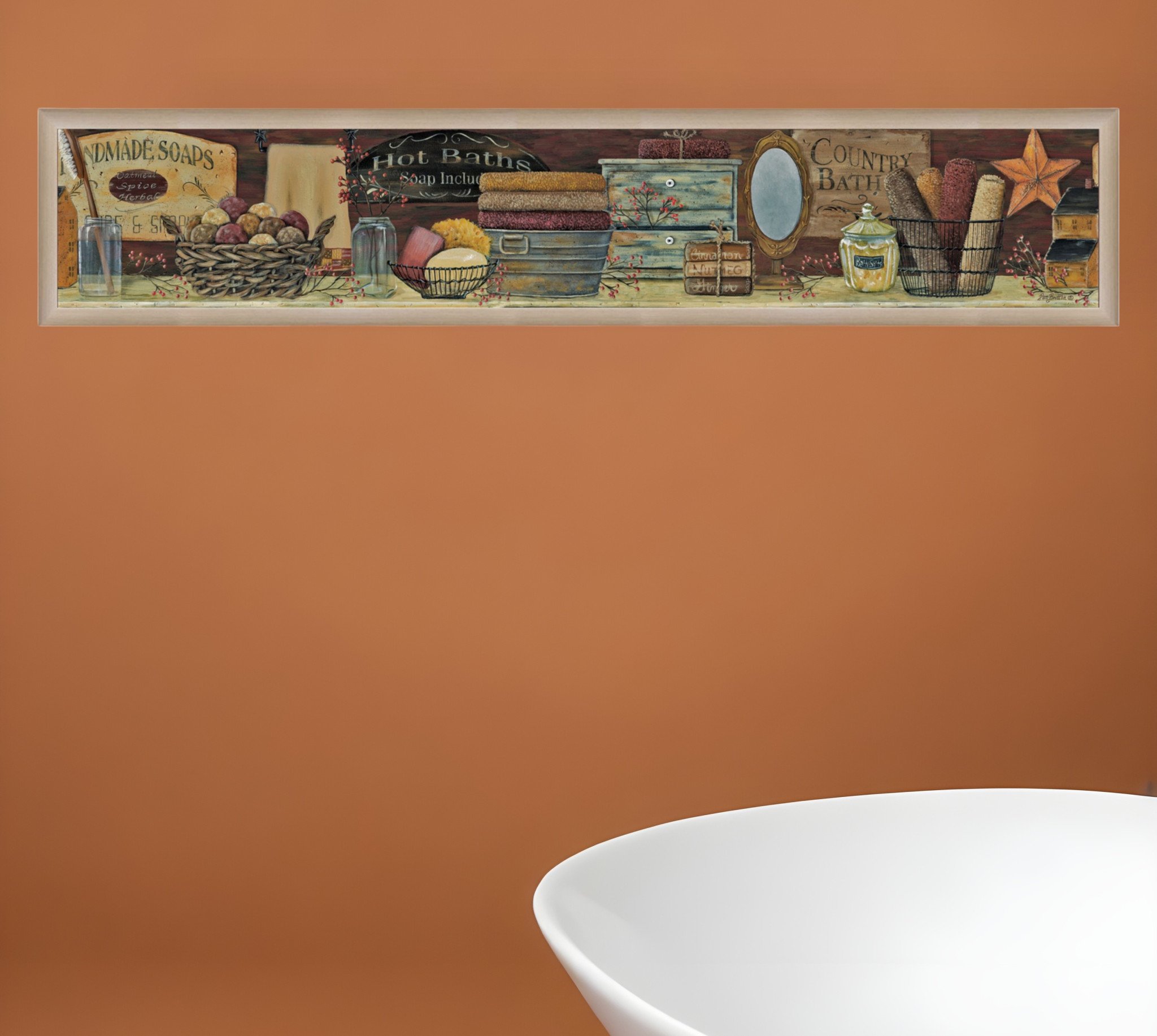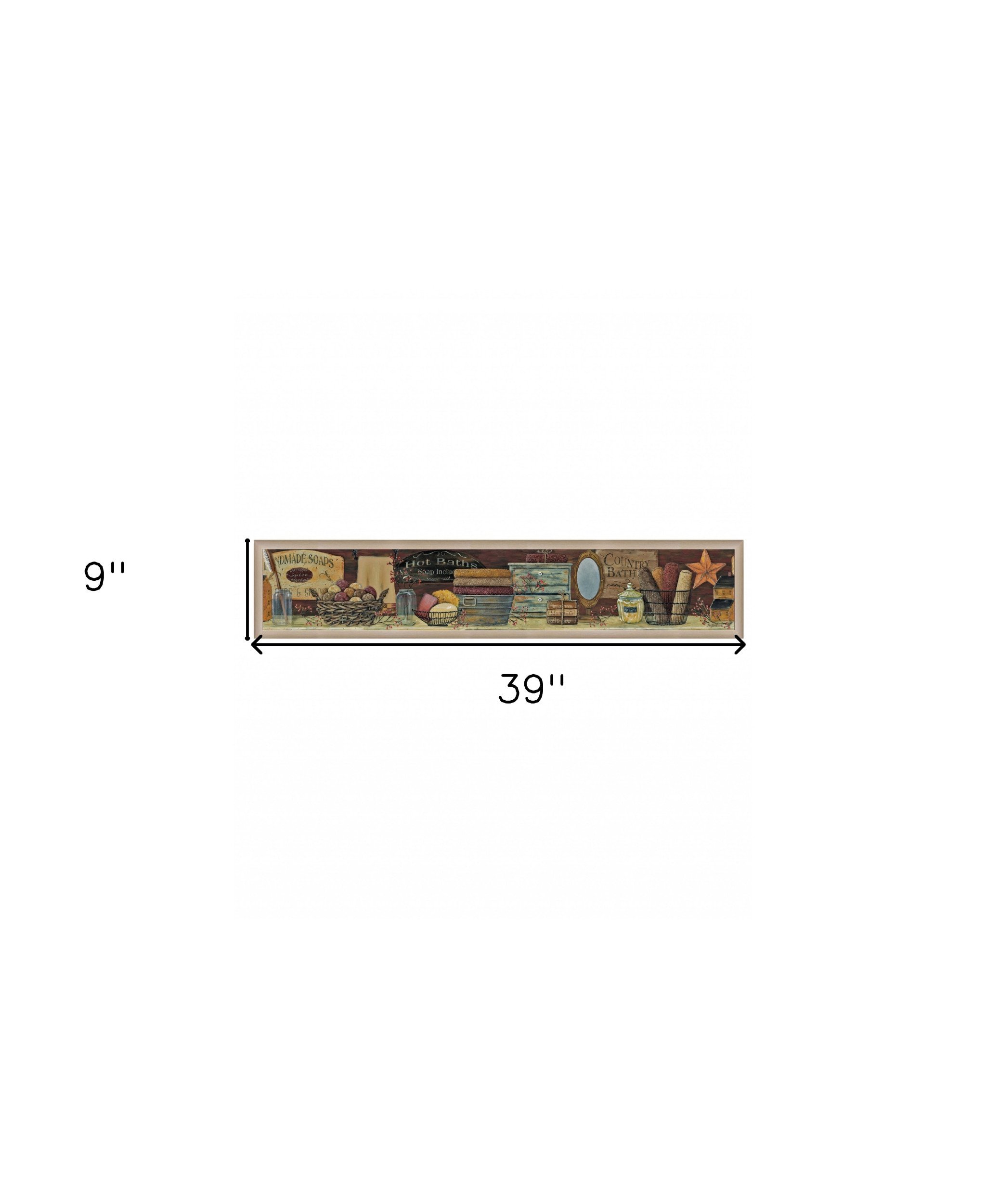 The country bath shelf 5 brown framed print bathroom wall art is the perfect decorative accessory for your home. This print is a visual artistic expression that allows you to decorate your space in style. Reproduced for you on paper, this hanging decorative accent will be a trendy and fashionable way to dress your walls. Adding this hanging wall art to your space to make your room feel more finished and attractive. Instantly liven up your space with this art that brings color and dimension to your walls. 9-inch H x 39-inch W x 1-inch D