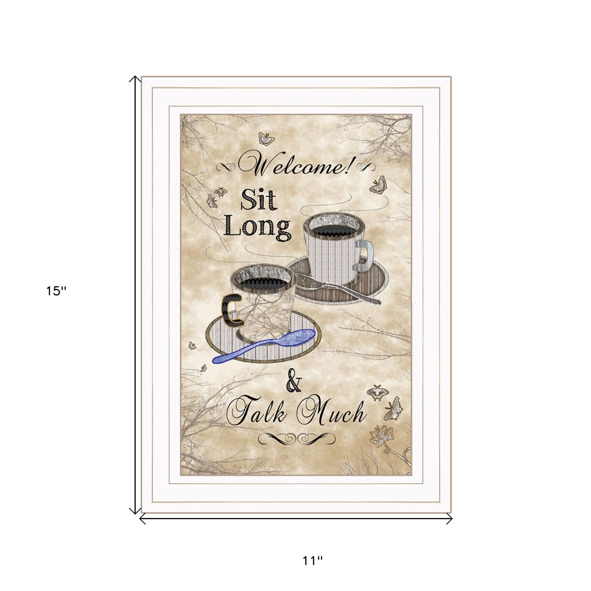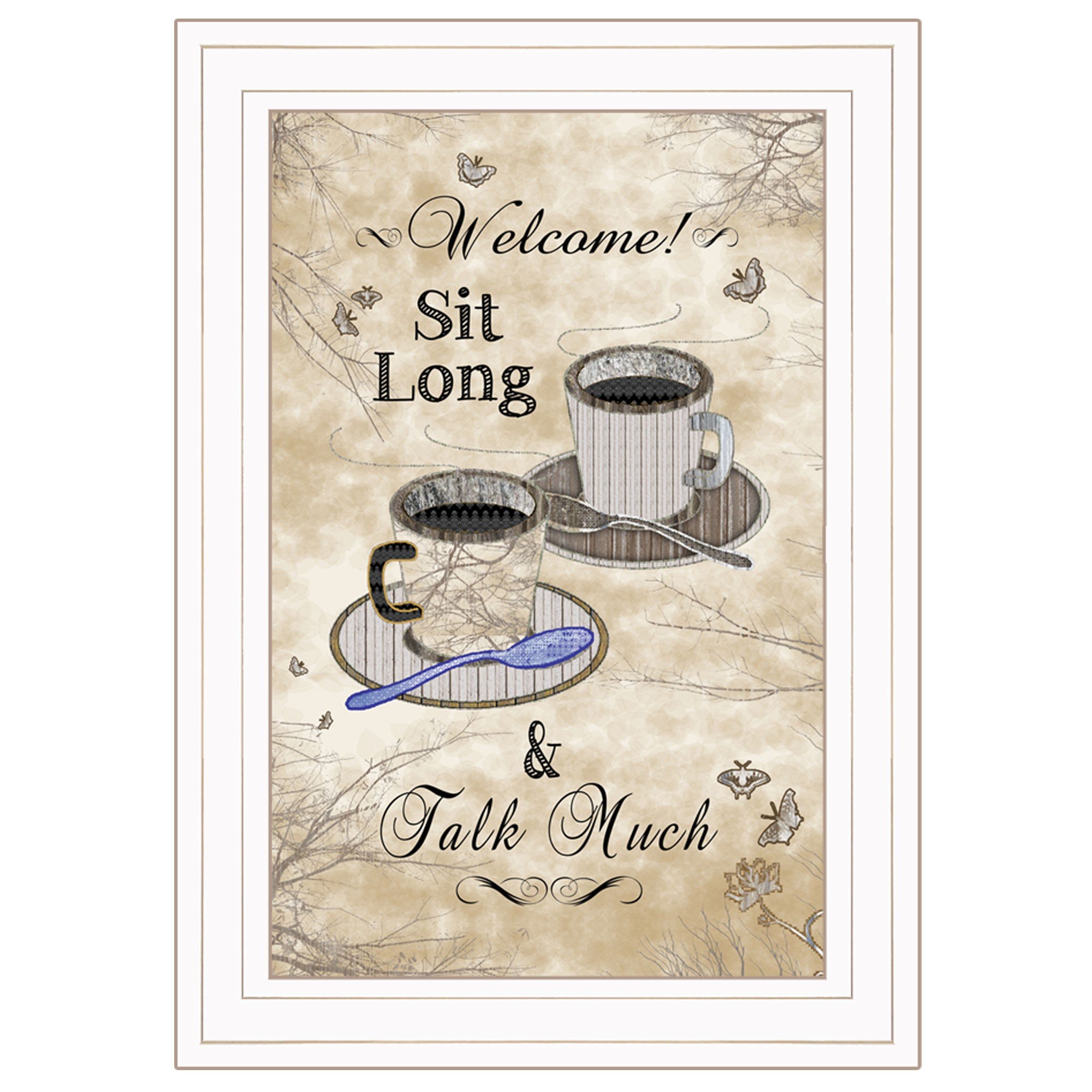 Bring some sizzle to your space with this eye-catching sit long talk much white framed print kitchen wall art. This print is a visual artistic expression that allows you to decorate your space in style. Reproduced for you on paper, this hanging decorative accent will be a trendy and fashionable way to dress your walls. Adding this hanging wall art to your space to make your room feel more finished and attractive. Utilize this opportunity to create a focal point in the room with this fabulous wall decor option. 15-inch H x 11-inch W x 1-inch D