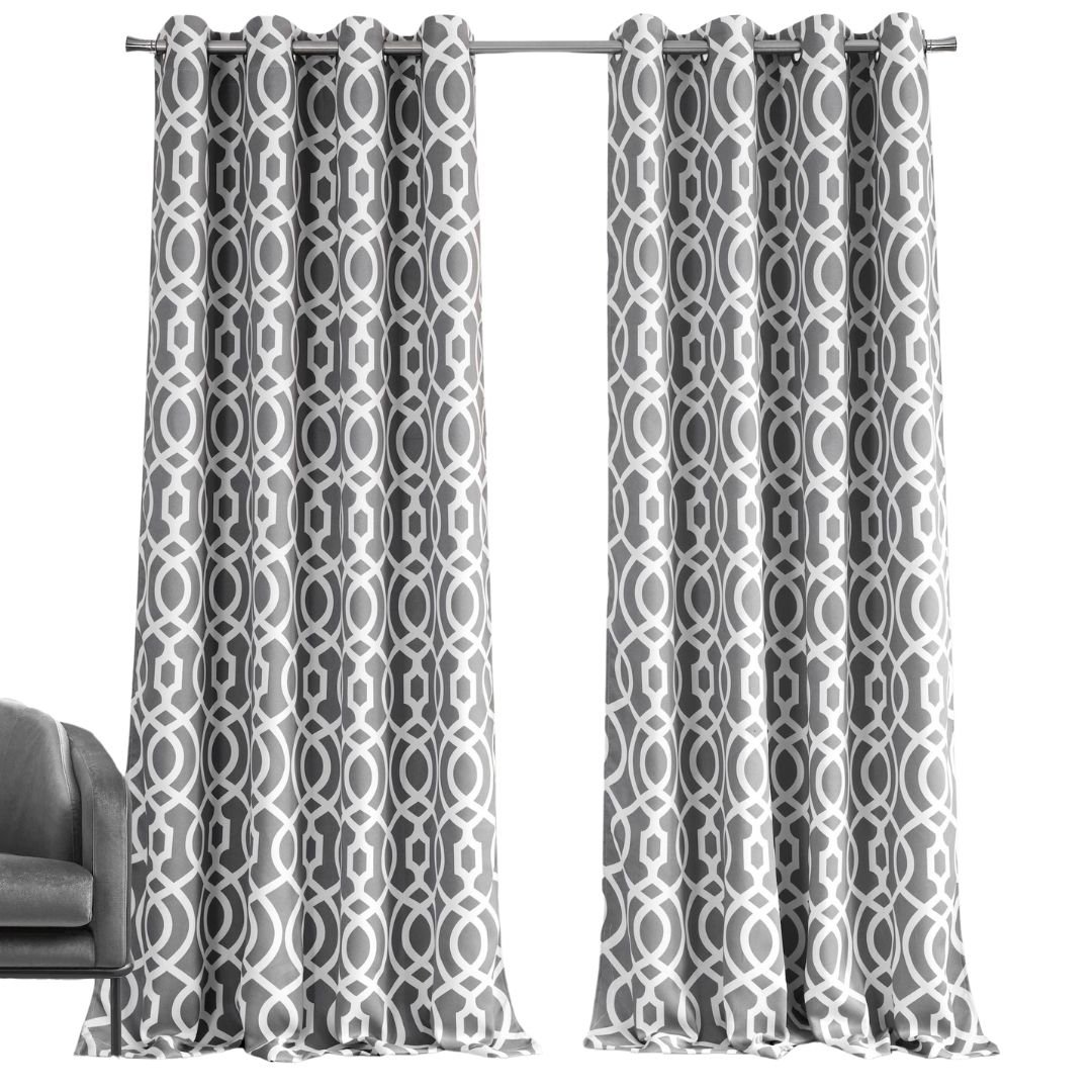 Beautiful  gray trellis black out window curtain panel. The stunning silver and white color combination effortlessly complements any decor. With its blackout light filtration, it ensures optimal privacy and blocks out excess sunlight.. Perfect for bedrooms or home theaters With its chic trellis design, this curtain panel is a stylish addition to any room.. Measuring 54 inches in width and 84 inches in length, this single panel provides ample coverage for your windows..