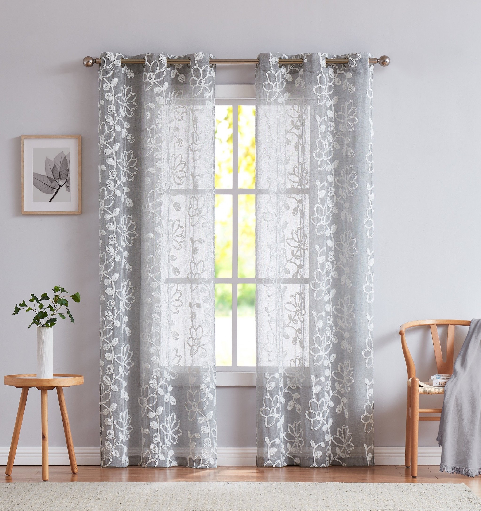 Elevate the style of your windows with this stunning set of two 84-inch silver floral embroidered window panels. Crafted from high-quality polyester, these contemporary curtains feature a beautiful silver color that will add a touch of glamour to any space. With a semi-sheer light filtration, they allow natural light to gently illuminate your room while still providing privacy. The 38-inch single panel width ensures that these curtains will elegantly drape over your windows, creating a sophisticated look. Measuring 84 inches in length from top to bottom, these window panels are the perfect size to enhance your home decor. Enhance the beauty of your living space with these exquisite silver floral embroidered curtains. 84-inch H x 76-inch W x 1-inch D