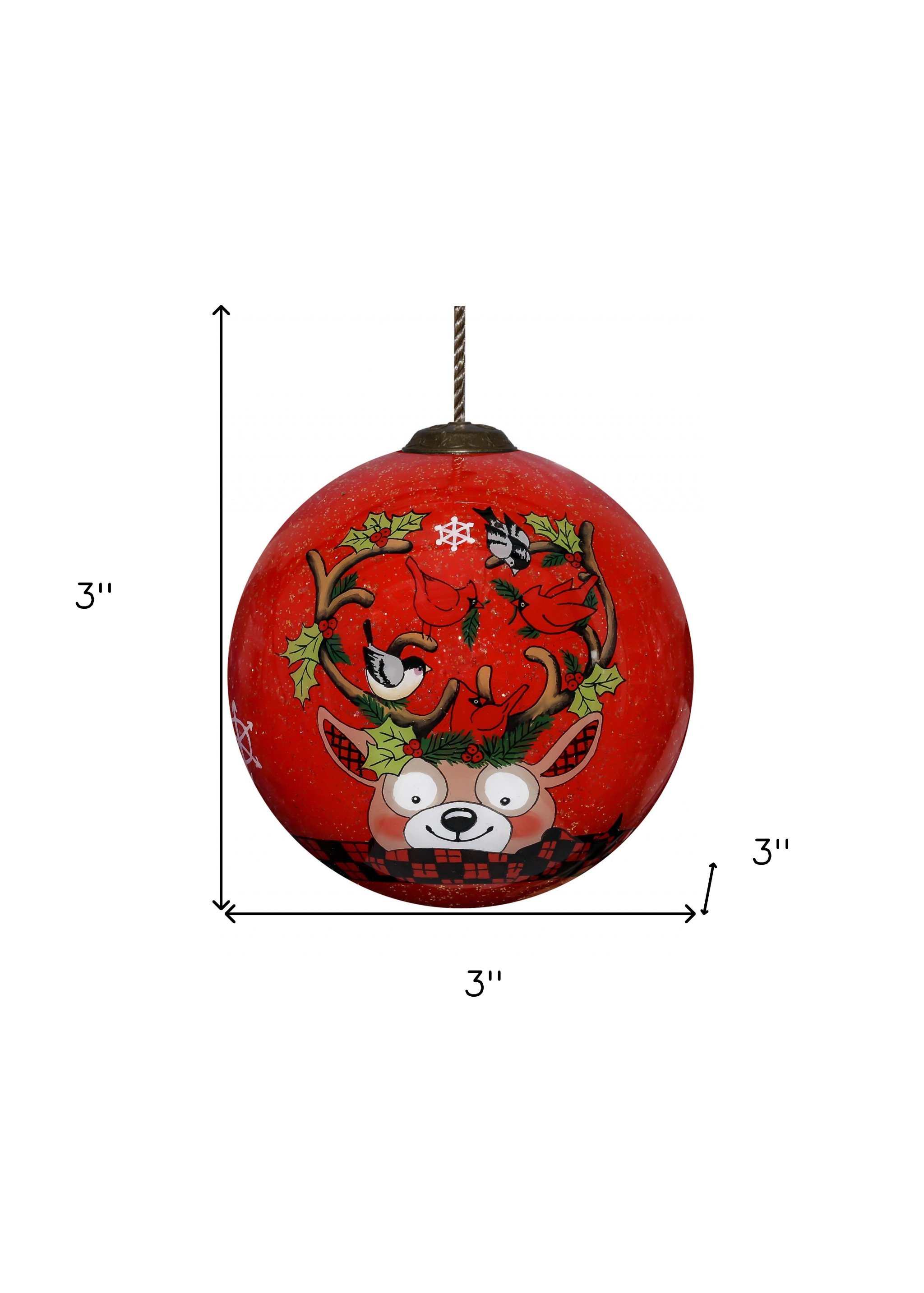 Spruce up your home with whimsical festive cheer with the Reindeer with Plaids and Cardinals Hand Painted Mouth Blown Glass Ornament. Using old world intricate techniques, the glass is hand-painted on the inside by skilled artisans. This gorgeous round shaped ornament will be a treasured keepsake for your tree but can also be hung easily on an ornament stand. 3" x 3" x 3"