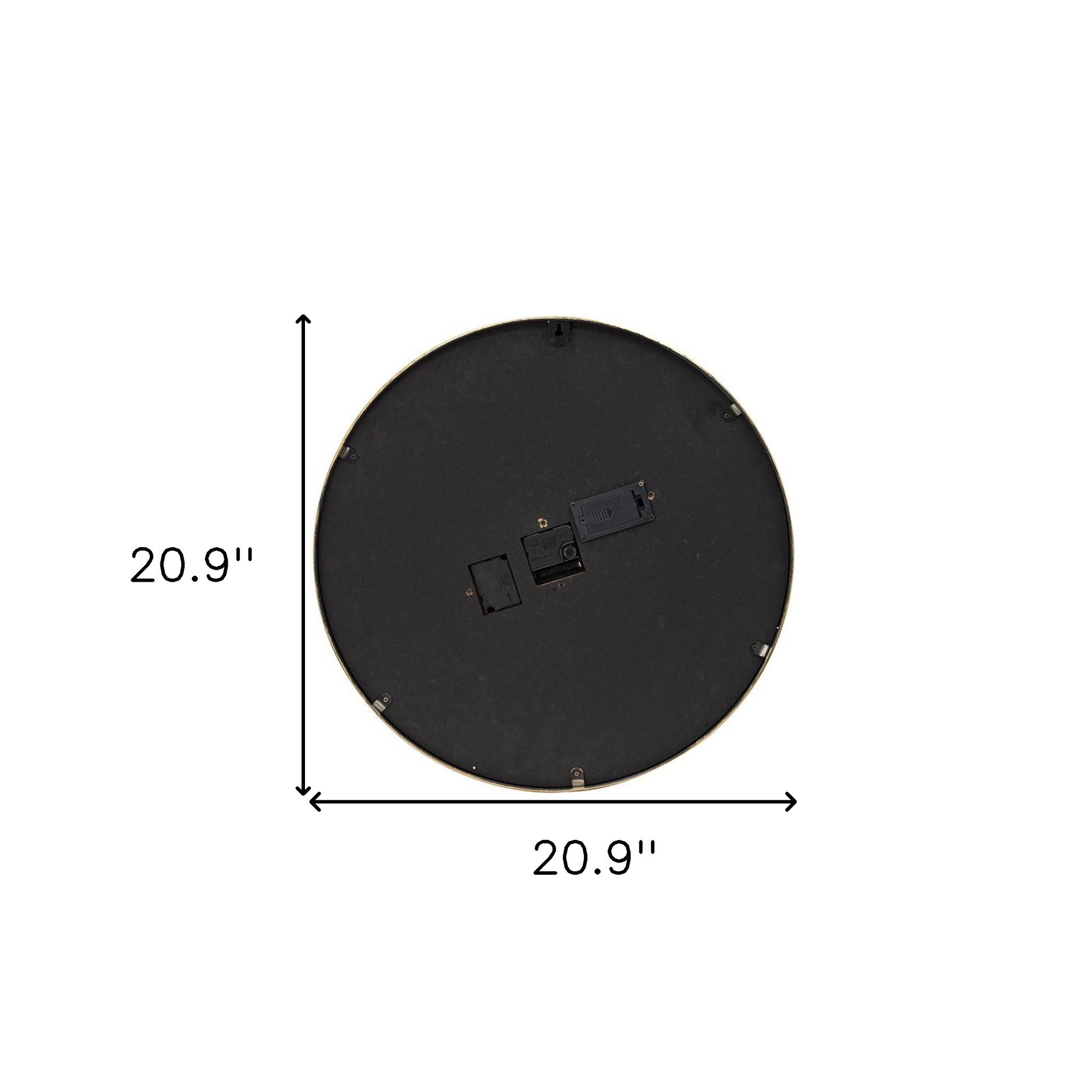 This 21-inch circle black and gold wood and glass analog exposed gear wall clock includes three moving hands on the face that move smoothly to indicate the hour, minute and seconds. The circle shape of this clock will bring a sense of wholeness to your home. The clock face not only looks good but is beautiful and uniquely made from glass. This clock was skillfully made with a purposefully distressed and vintage style finish. Elevate the decor of any room in your house. With its unique design and practical purpose, this clock will add flair to your home while also acting as an essential tool. 20.9-inch H x 20.9-inch W x 3.5-inch D