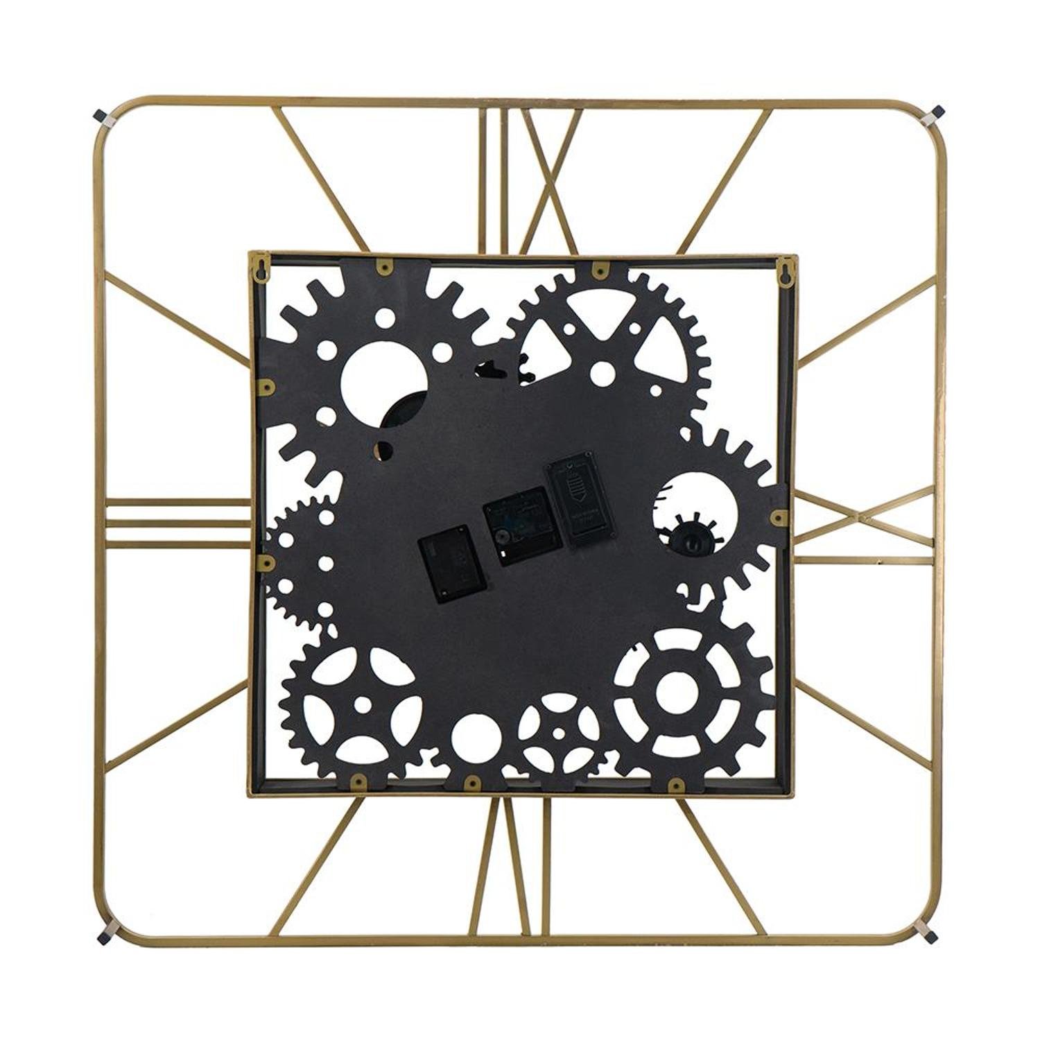 This 32-inch square gold metal and glass analog exposed gear wall clock includes three moving hands on the face that move smoothly to indicate the hour, minute and seconds. Features a practical, straight-edged square shape.. The clock face not only looks good but is beautiful and uniquely made from glass. Elevate the decor of any room in your house. With its unique design and practical purpose, this clock will add flair to your home while also acting as an essential tool. 35.4-inch H x 31.5-inch W x 3.3-inch D