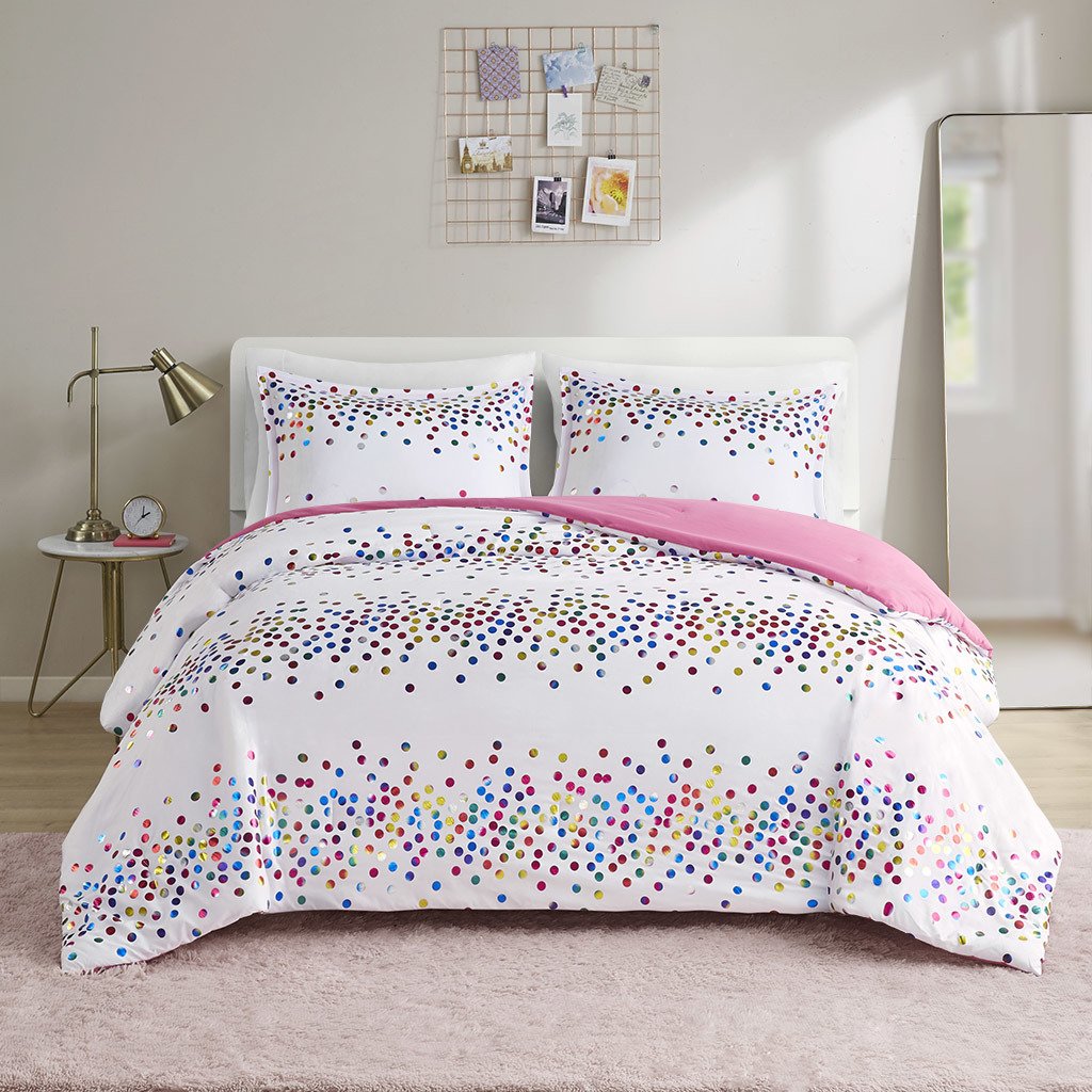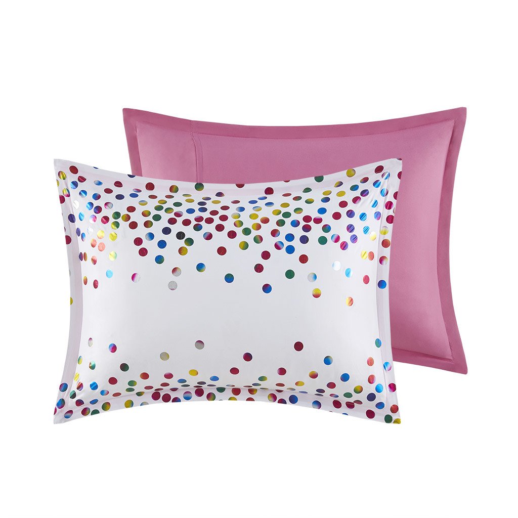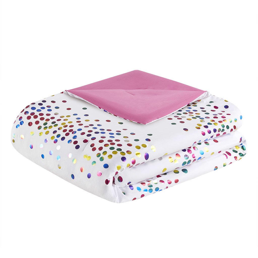Make your bedroom sparkle with the Intelligent Design Janie Rainbow Iridescent Metallic Dot Comforter Set. Flaunting iridescent metallic dots all over the face of the comforter, this casual bedding set brings a vibrant and fun look to your bedroom. The matching shams (1 in Twin/TwinXL) complete the whimsical charm of the rainbow bedding to fully brighten your bedroom. Hypoallergenic polyester filling in the rainbow comforter contains no allergens and is treated to be dustproof. Machine washable for easy care, this sparkly comforter set is OEKO-TEX certified, meaning it does not contain any harmful substances or chemicals to ensure quality comfort and wellness. An antimicrobial treatment helps reduce the growth of odor causing bacteria and keeps fabric lasting longer. Items may come in rolled or compressed packing and will need to be fluffed up. Use a steam iron to help remove wrinkles easier.
