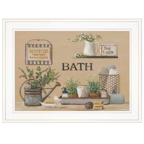 "Farmhouse Bath II" by artisan Pam Britton. This decorative white framed 1-pc(19x15) says" Bath House tin sign" in a room that makes you to want relax! Shelf of towels, bath soap, floral, soap everything you need to relax and enjoy. Crafted By Skilled American Crafters And Coated With A Fade-resistant Texture, This Piece Has A Canvas-like Appearance That Will Last For Years To Come. Invest In A Piece That Is Truly One-of-a-kind.•Transform your walls with this stunning piece of art and bring a touch of modern elegance to your room. This stunning piece will not only add visual interest to any room but it's minimalist design will bring a sense of serenity to your space.•Tired of dull, empty walls in your home? We believe that walls should inspire, not bore. That's why we offer a wide range of wall art to suit any space from bedroom and kitchens to office and beyond. Give your walls a facelift with our printed arts and transform your space into a stylish and inviting home.•This framed wall art is hand-crafted in the USA of high-quality wood with the surface of the art coated with a fade-resistant texture which gives it a canvas-like appearance for many years of enjoyment in your home.•Bring a pop of colour and style to any room with our fully assembled and ready-to-hang wall art. With a wide selection of decorative pieces to choose from, you'll easily find the perfect match for your personal taste or to give as a thoughtful gift. Don't miss out on the opportunity to add some unique charm to your space.•Experience the unmatched quality and durability of American-made craftsmanship with this individually hand-crafted wall decoration art. Skilled crafters put their expertise into every piece to ensure it will stand test of time and bless your eyes for years to come.